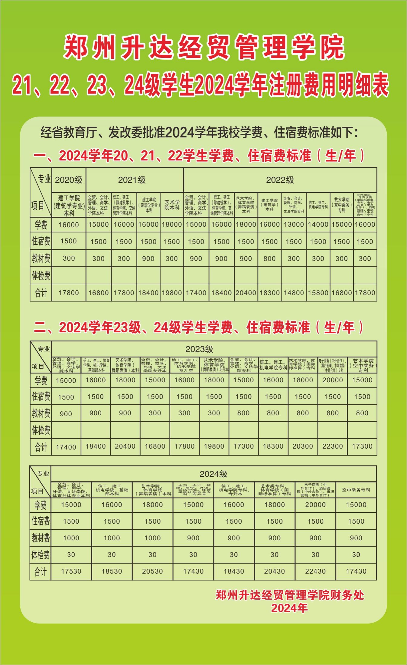 郑州升达经贸管理学院2024学年注册费用明细表