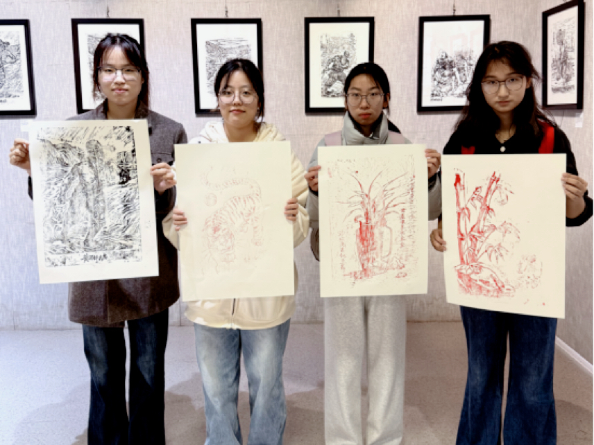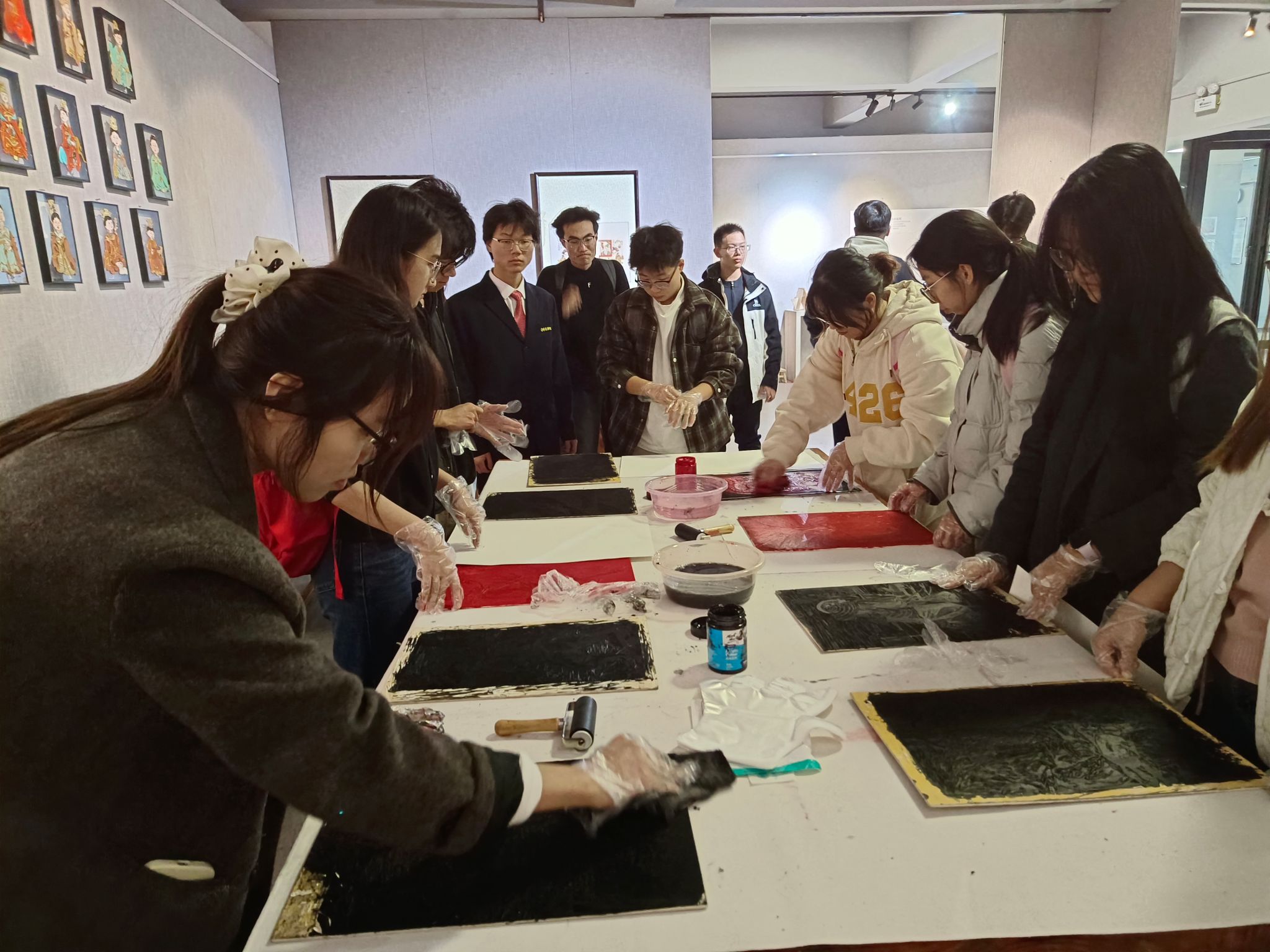 本次展览以“铸牢中华民族共同体意识”为主题,通过百余幅书画、摄影作品,生动展现了各民族在历史长河中交往交流交融的生动场景,讴歌了民族团结进步的光辉历程,呈现了新时代各民族共同团结奋斗、共同繁荣发展的精神风貌。在参观过程中,师生们认真聆听讲解,不时驻足观看、交流感悟。一幅幅精美的书法作品笔力遒劲、寓意深远;一张张生动的摄影照片记录着民族地区的发展变迁与人民幸福生活的瞬间;一幅幅绘画作品色彩斑斓、意境悠长,让大家深切感受到中华文化的博大精深和各民族像石榴籽一样紧紧相拥的深厚情感。最后,讲解人不仅生动地介绍了木版年画的起源与发展,还带领大家亲手体验制作,整个过程不仅让大家感受到传统手工艺的精妙,也体会到了创作的乐趣与成就感。