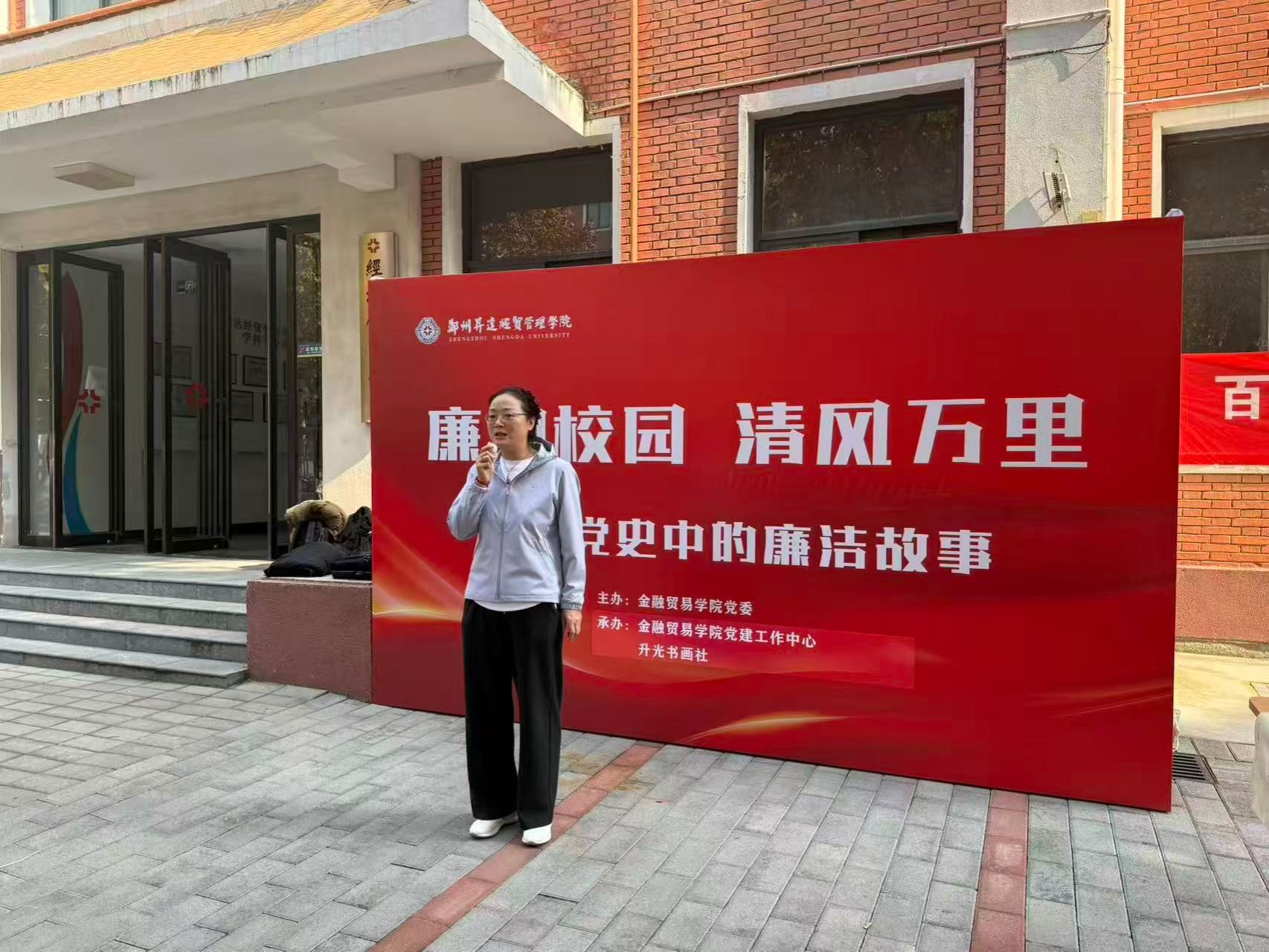 11月5日,“百年党史中的廉洁故事”主题展出活动在3号教学楼前举行。本次活动由金融贸易学院党委主办,金融贸易学院党建工作中心、升光书画社承办,活动以感悟廉洁故事,筑牢思想防线为主题。