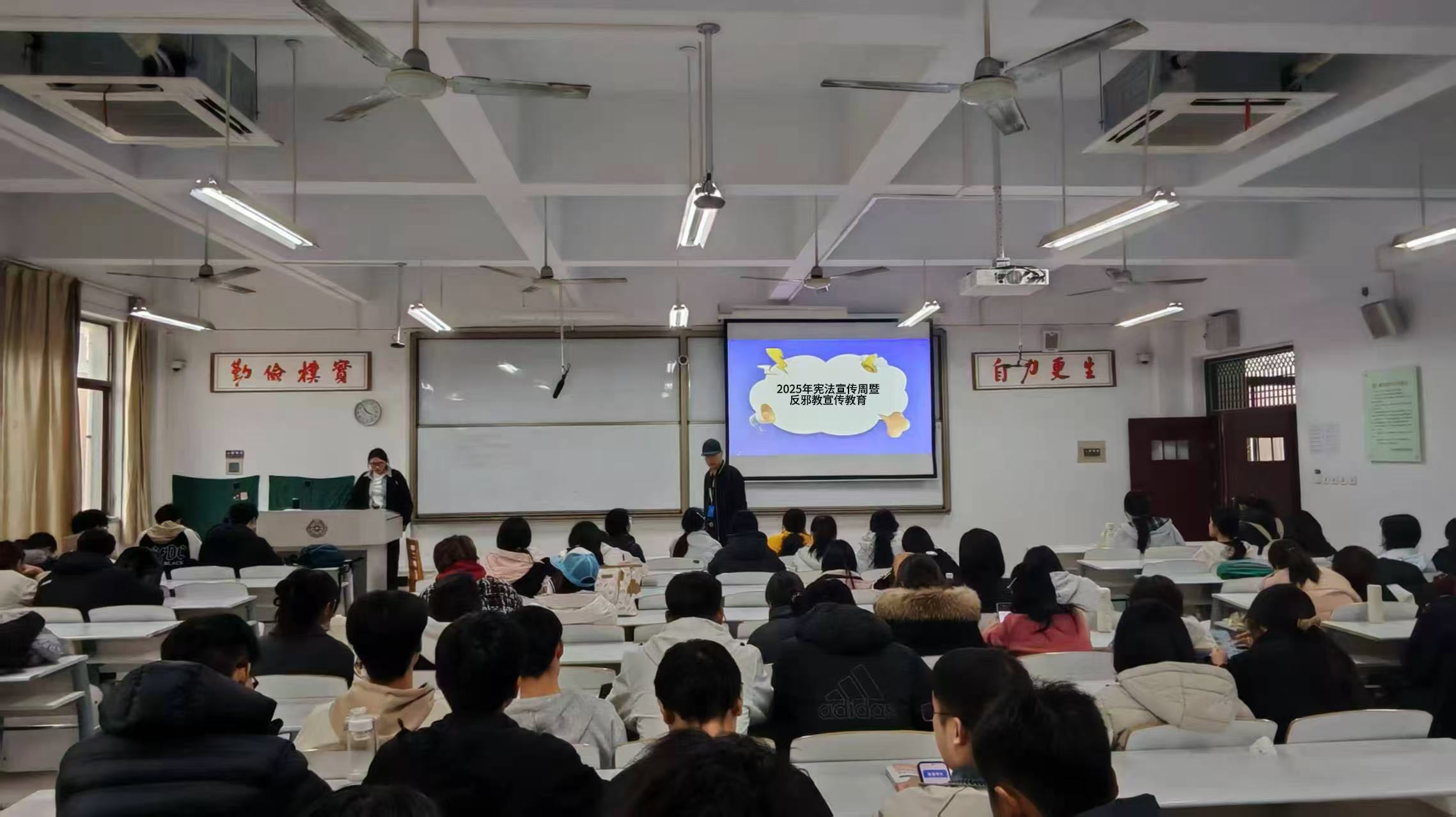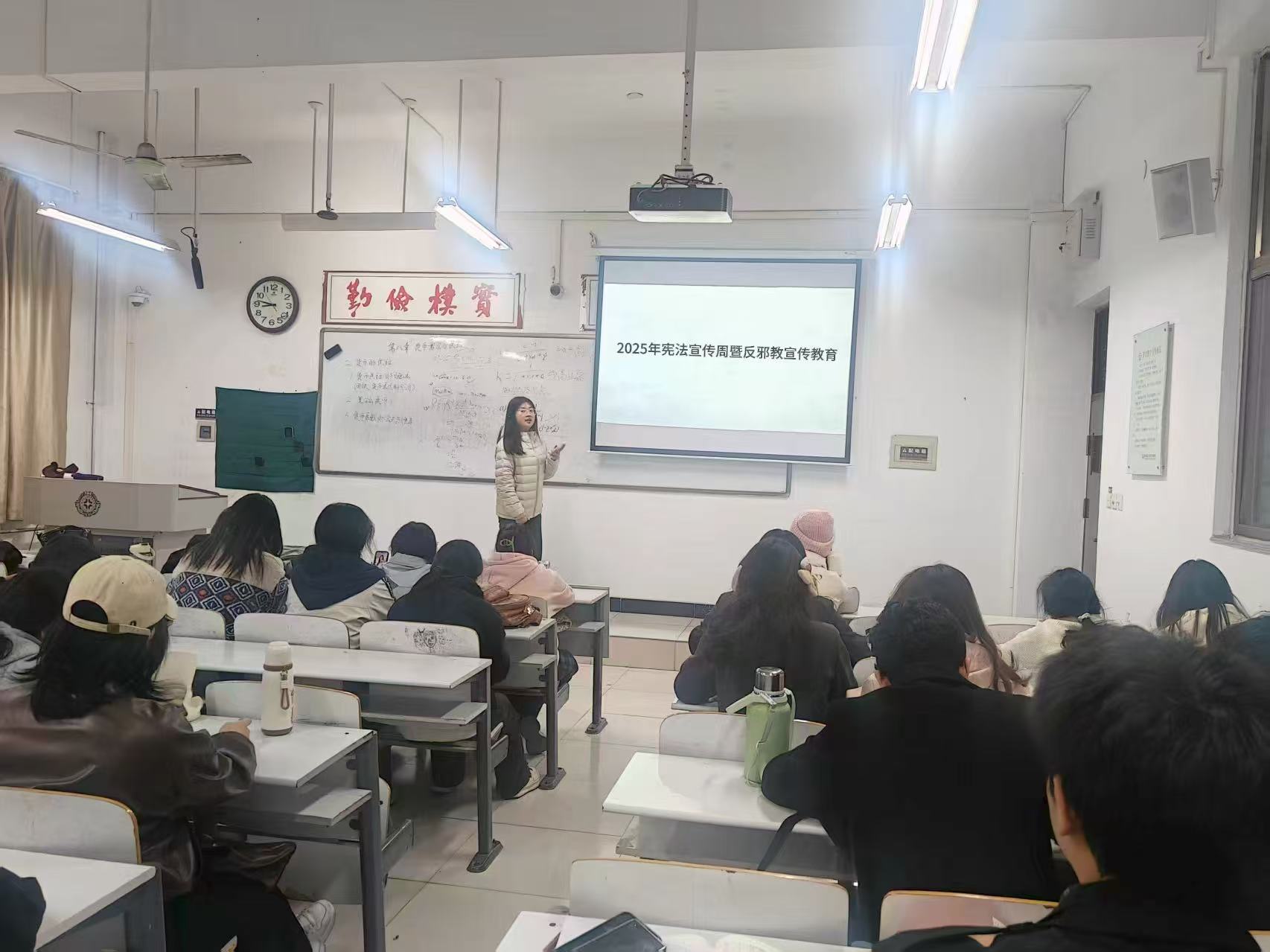 作为系列活动的核心环节,各班级以 “学宪法・反邪教・守平安” 为主题同步开展班会,实现全院年级、班级全覆盖。反邪教协会骨干成员化身 “青年宣讲员”,走进课堂通过 PPT 演示、案例拆解、互动问答等形式,结合邪教组织 “精神控制”“编造歪理”“敛财害命” 的典型特征,用真实案例揭露邪教对个人、家庭及社会的严重危害。为提升参与感与实效性,同学们在宪法条文、反邪教法规抢答中深化记忆,将法治信仰与反邪决心转化为自觉行动。