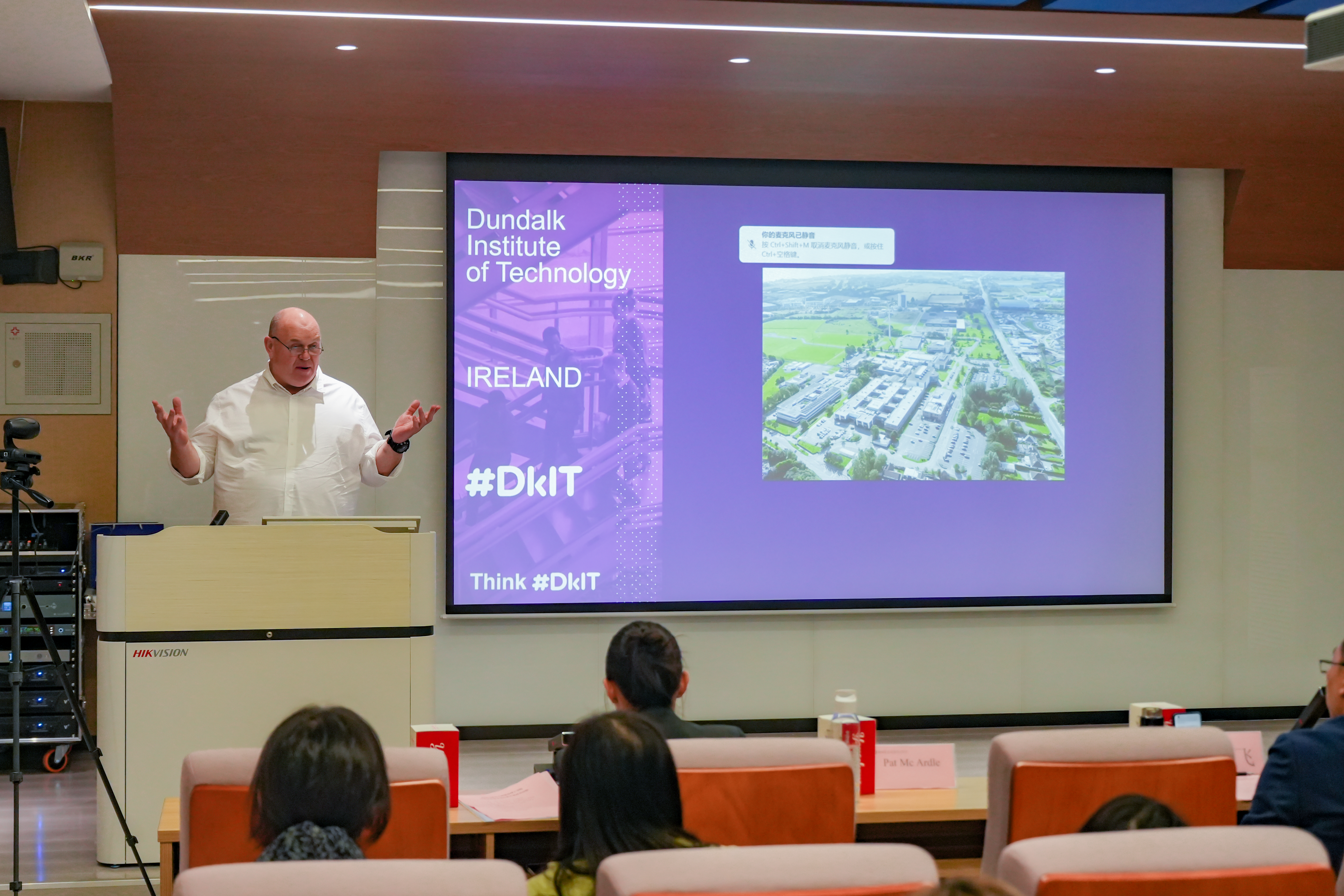 帕特麦克教授发表了热情洋溢的演讲。他结合自己多次来校授课的亲身经历,赞扬了我校新校区的建设与发展。他寄语新生,大学时光不仅是为了获取一纸文凭,更是为了构建个人核心竞争力,让自己在未来的求职市场中脱颖而出。他还生动介绍了DkIT小班教学、学生社团活动、以及生活成本低廉、交通便利等优势。