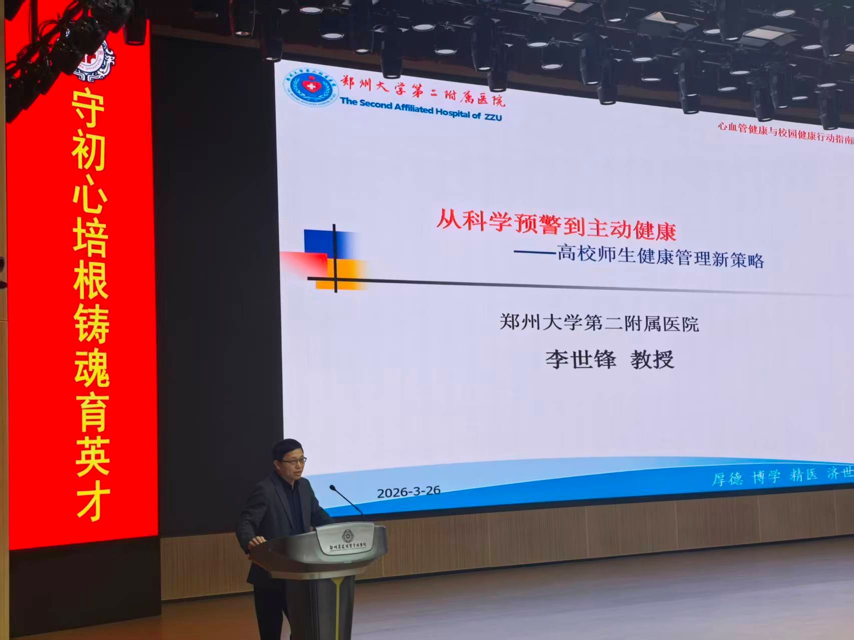 3月26日下午,郑州大学第二附属医院主任医师、硕士生导师李世锋教授莅临我校作“从科学预警到主动健康——高校师生健康管理新策略”专题讲座,本次讲座在图书馆三楼报告厅举办,校工会办公室主任王凯主持,500余名师生代表参加。讲座中,李世锋教授结合当前高校师生健康实际,用详实数据揭示了校园健康风险。他指出,高.........[详细]