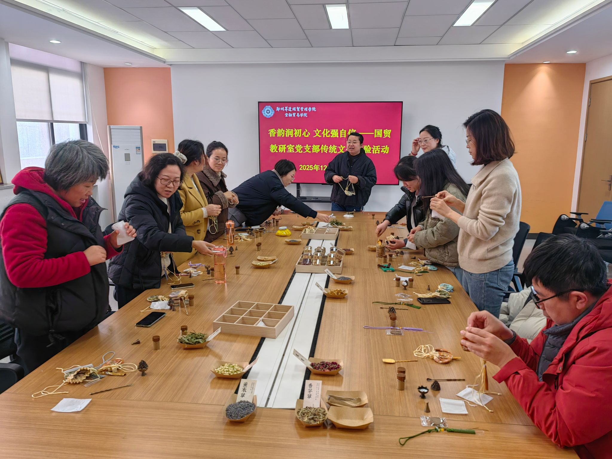 12月25日,国际贸易教研室党支部组织全体支部党员开展“香韵润初心 文化强自信”传统文化体验活动,以塔香制作、香囊DIY为载体,在动手实践中感悟传统香文化的独特魅力。