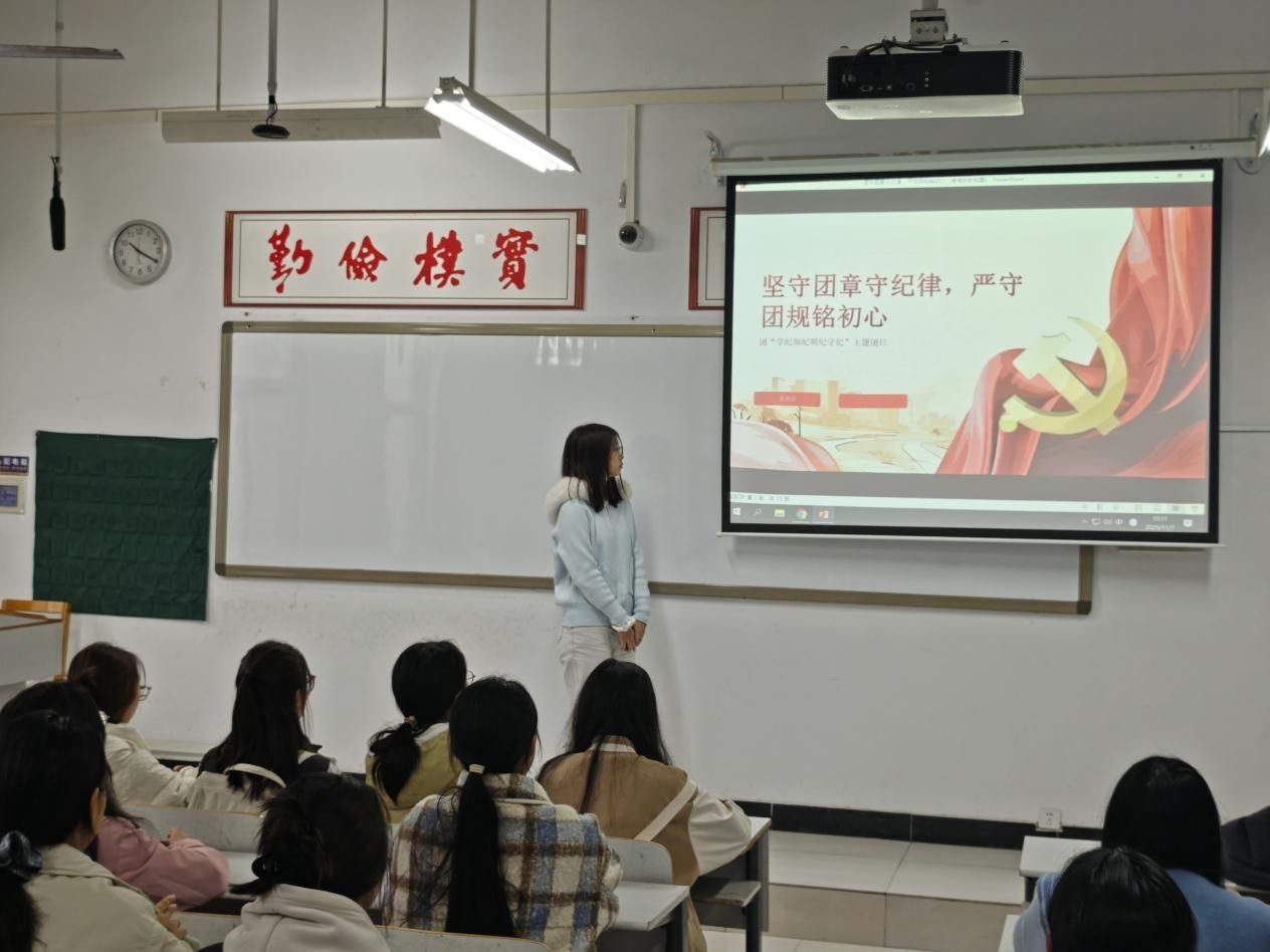 团日活动以团支书的PPT宣讲拉开序幕,她现场提到:“咱们支部这段时间的团日活动、志愿项目能顺利推进,靠的是大家守规矩、拧成一股绳——团章不是‘纸面上的条文’,是咱们支部凝聚力的‘黏合剂’。”宣讲后,团员们围绕“团规与我的支部生活”交流,现场氛围轻松而热烈:有同学分享参与团日活动时的集体荣誉感,也有同学提到团课让自己更明确“团员身份意味着主动担当”。
