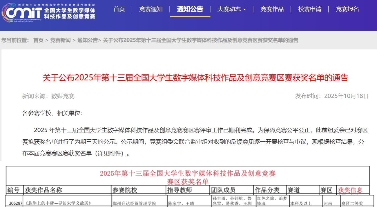 近日,2025 年第十三届全国大学生数字媒体科技作品及创意竞赛赛区赛评审工作落幕。由我校艺术学院传媒社团报送的作品《悬崖上的丰碑——寻访宋学义故居》荣获河南赛区二等奖。