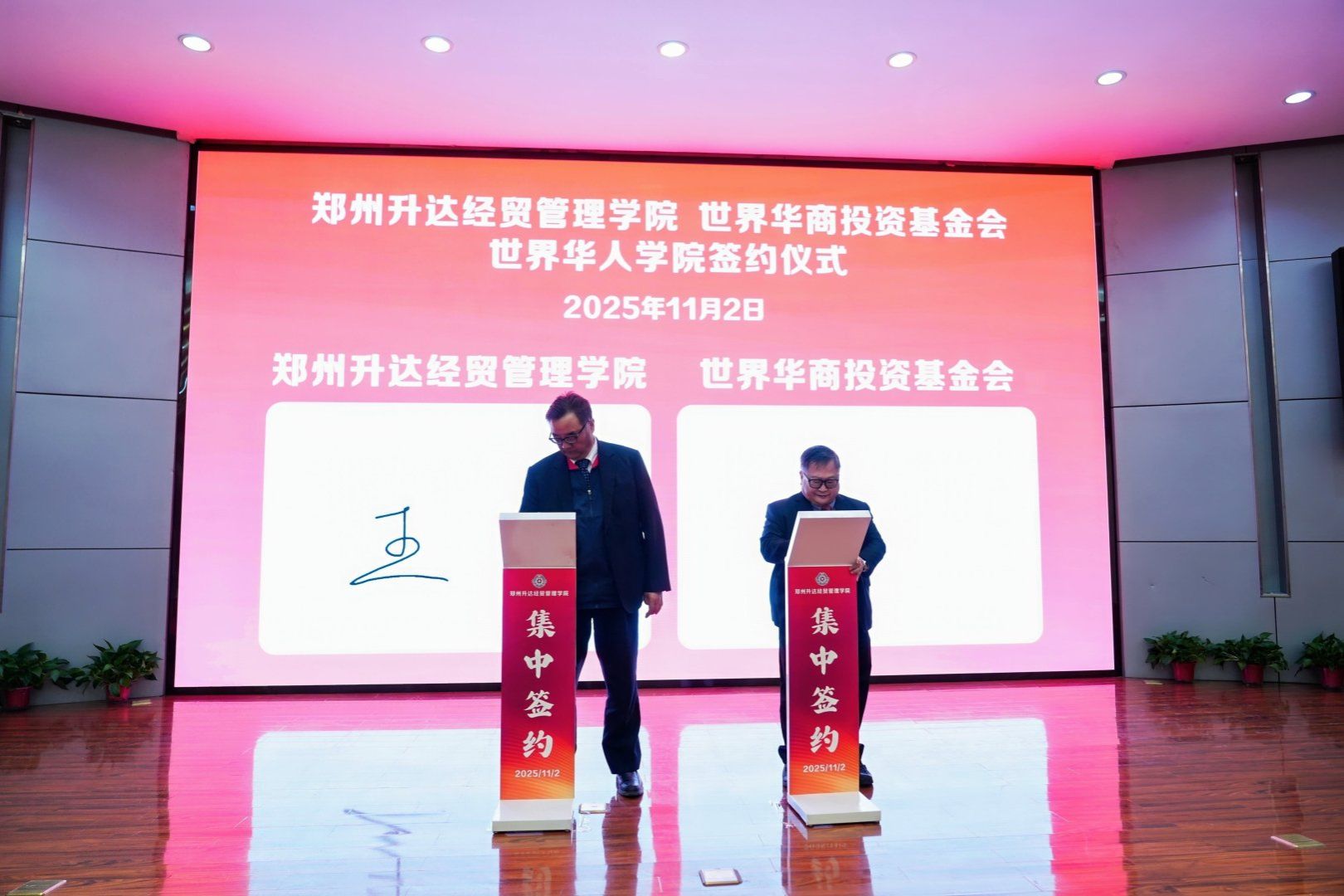 王新奇与世界华商投资基金会主席马兴利共同签署了世界华人学院战略合作协议。