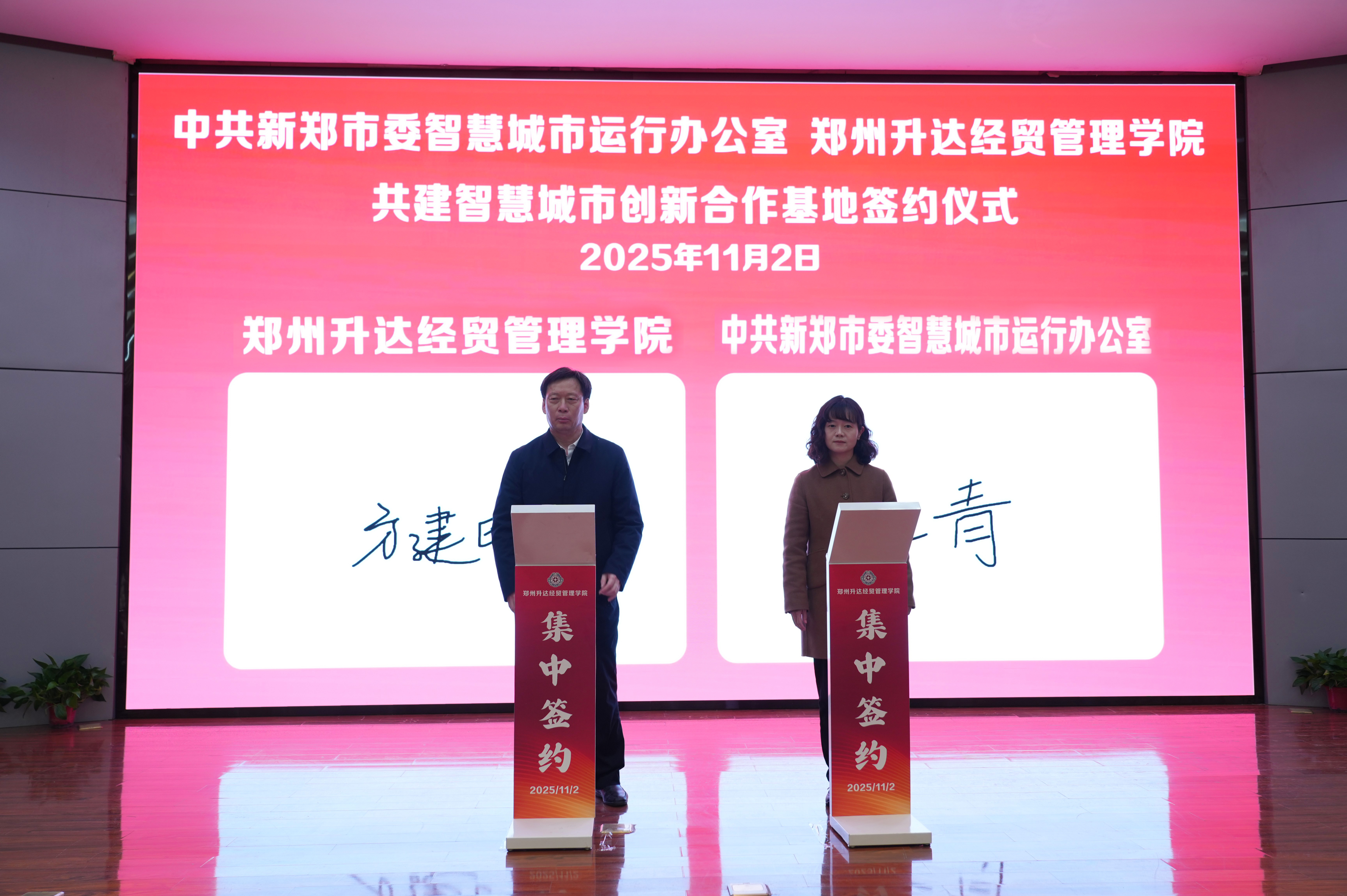 中共新郑市委智慧城市运行办公室王青与我校校领导共同签署了智慧城市创新合作基地战略合作协议。