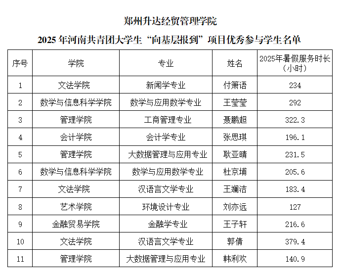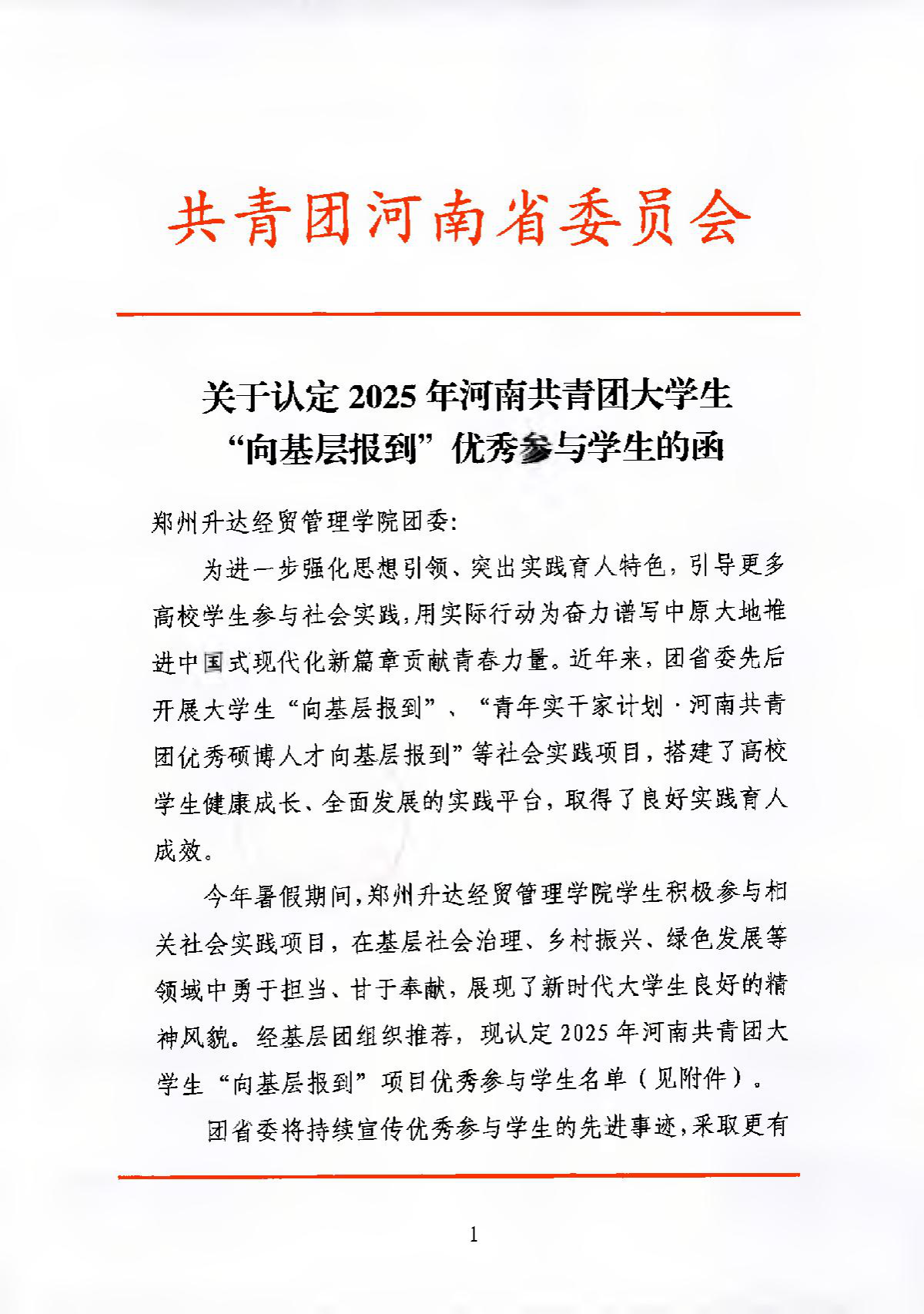 近日,共青团河南省委组织部(基层组织建设部)发布《关于认定2025年河南共青团大学生“向基层报到”优秀参与学生的函》,从函中获悉,我校共有11名同学凭借在基层服务中的突出表现和显著成效,被认定为“优秀参与学生”,这不仅是对“向基层报到”成绩突出学生的赞誉,更是对我校长期坚持实践育人、引导学生扎根基层服务社会工作的充分肯定。