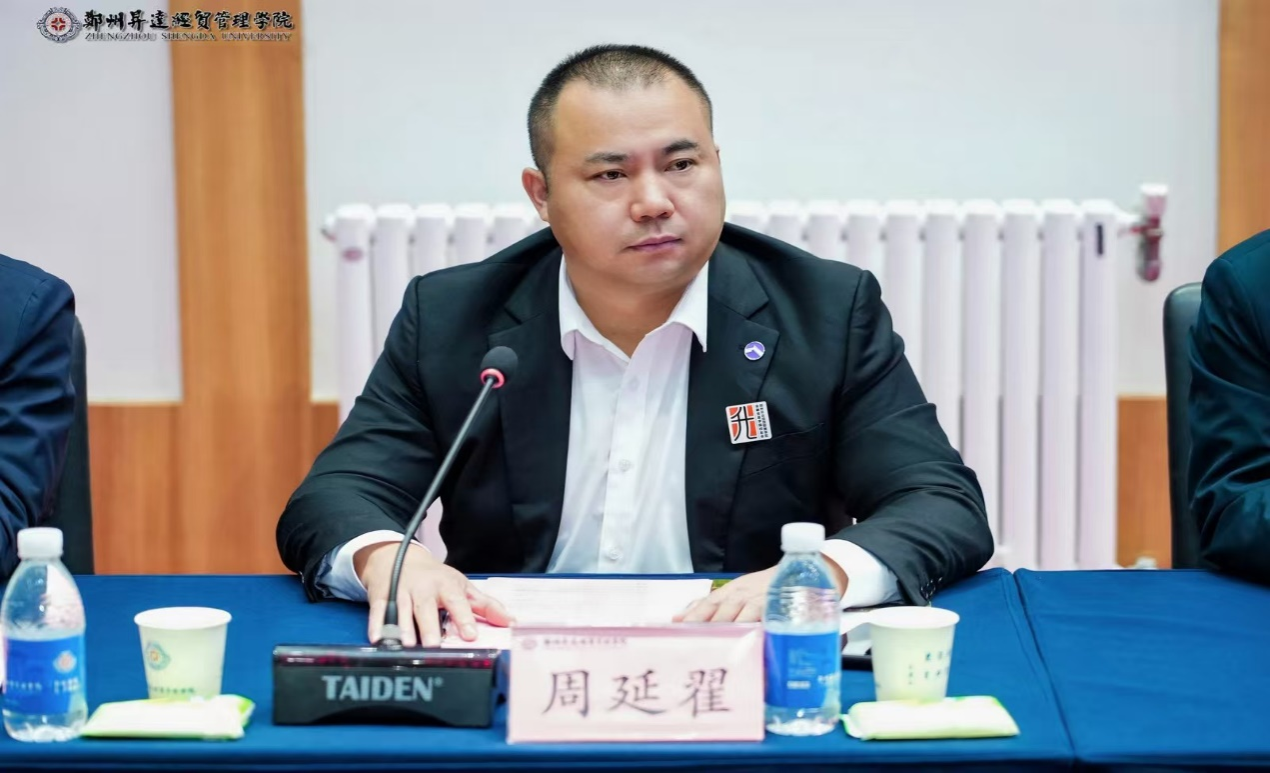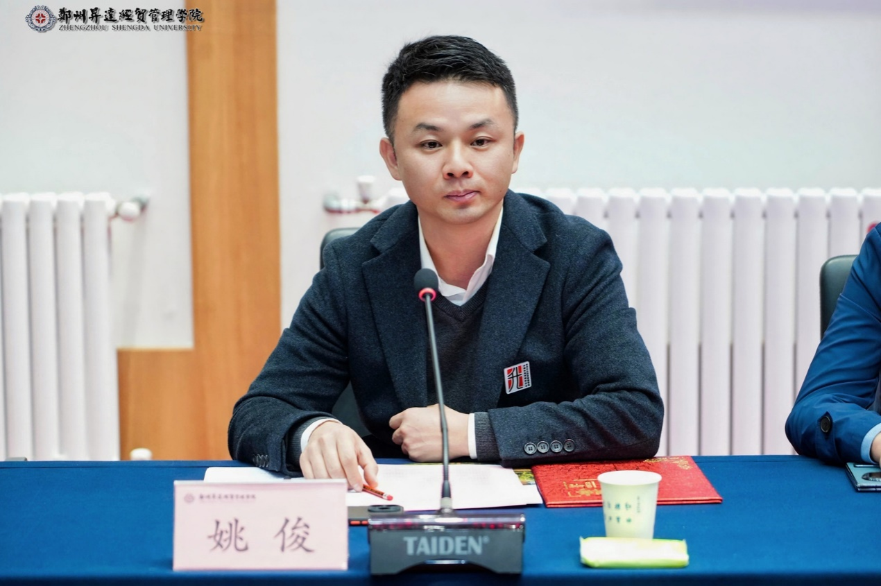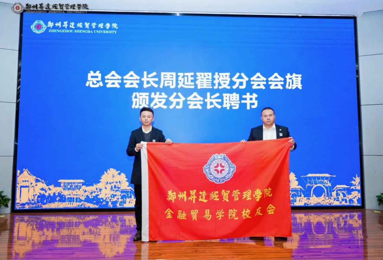 周延翟会长宣读《关于同意成立金融贸易学院校友分会的批复》,并宣布金融贸易学院校友分会会长、秘书长名单。周延翟向金融贸易学院校友会会长姚俊授会旗,宣布郑州升达经贸管理学院金融贸易学院校友会正式成立。