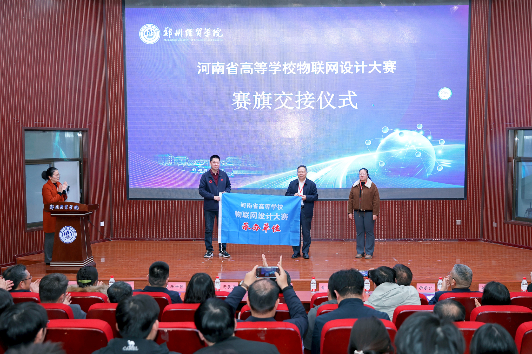 大赛闭幕式上,备受关注的赛旗交接仪式顺利举行。信息工程学院院长程杰教授代表学校接过赛事会旗,标志着2026年(第十二届)河南省高等学校物联网设计大赛正式确定由郑州升达经贸管理学院承办。程杰教授在交接仪式上表示,学院将传承赛事优良传统,全力做好赛事组织、场地保障与服务协调工作,为全省高校搭建更高质量的交流平台,助力物联网领域创新人才培养。