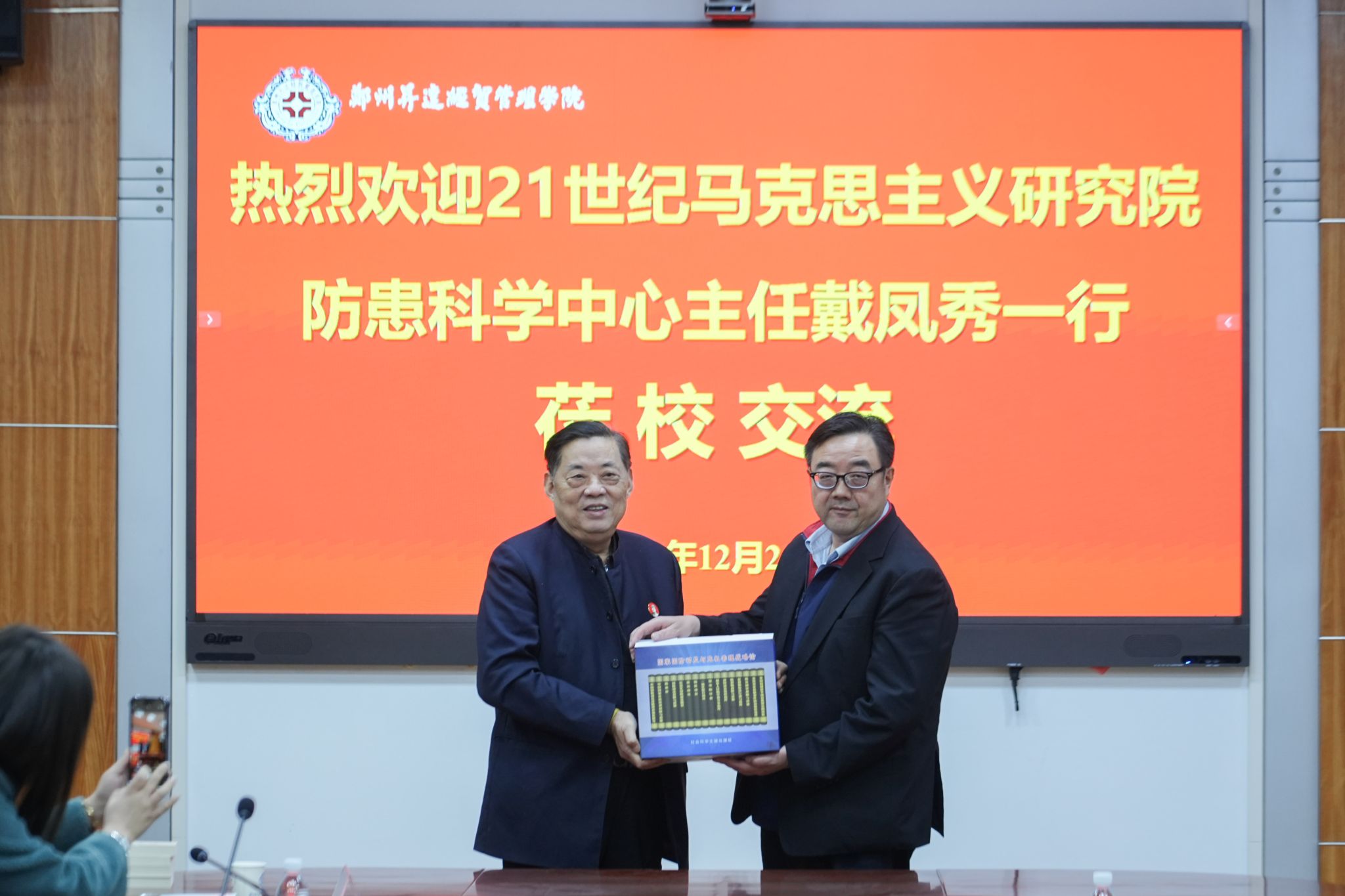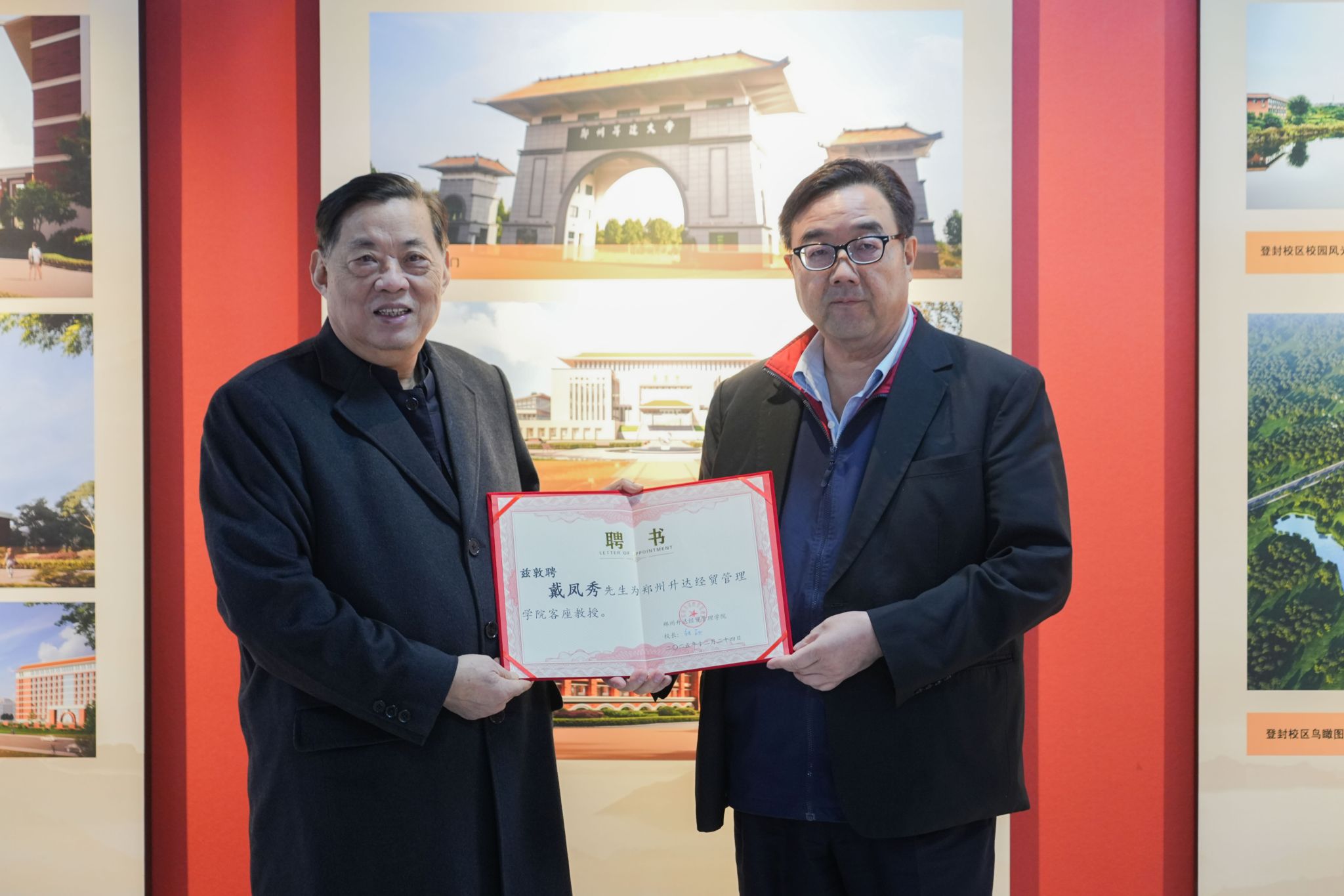 王新奇董事长为戴凤秀主任颁发客座教授聘书,双方互赠纪念品并合影留念。