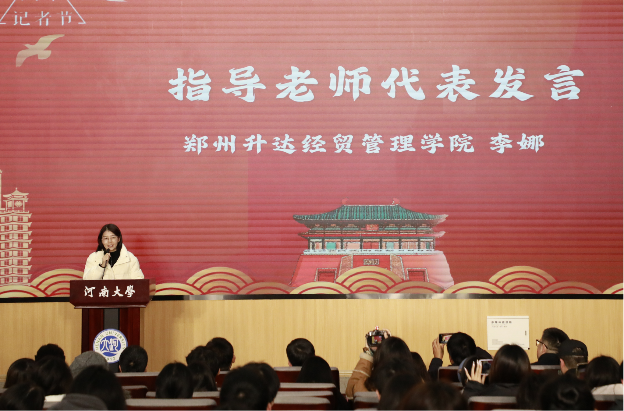 这些成绩充分展现了文法学院新闻学和网络与新媒体专业在跨媒介叙事、视听表达与融合传播方面的教学成效,荣誉背后更离不开指导教师团队的悉心指引。颁奖仪式上,文法学院李娜老师作为指导教师代表分享了她的感悟与经验。她以获奖作品的诞生过程为例,生动阐述了如何引导学生在广阔的社会现实中寻找选题,在扎实的田野调查中打磨笔力,并以“铁肩担道义,妙手著文章”与师生共勉,鼓励学生成长为有温度、有担当的时代记录者。