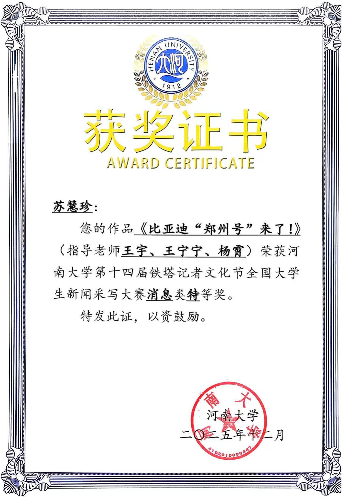 荣获特等奖的两部作品分别是2023级新闻专业学生韩思懿、付箫语、刘文悦的通讯作品《农村大病家庭的“生命赌局”:想要命,就是拿钱来换》和2022级新闻专业学生苏慧珍的消息作品《“比亚迪”郑州号来了!》。通讯作品以深沉的笔触关注社会现实,揭示了重大疾病给农村家庭带来的经济与伦理困境,彰显了新一代新闻人的社会责任与人文关怀;消息作品则敏锐捕捉城市发展动态,以精准简练的笔法快速传递了重要信息,体现了新闻的时效性与专业性。