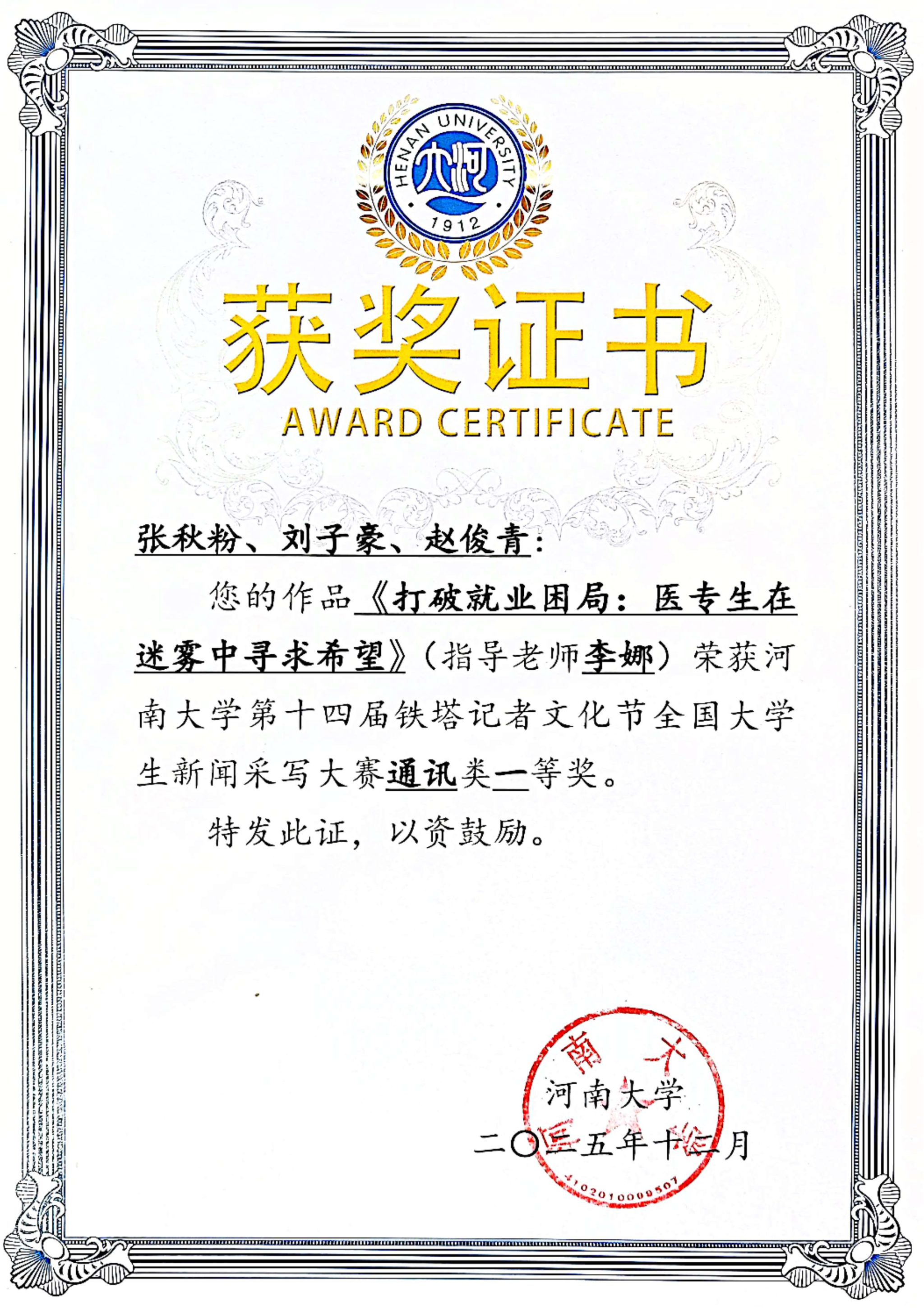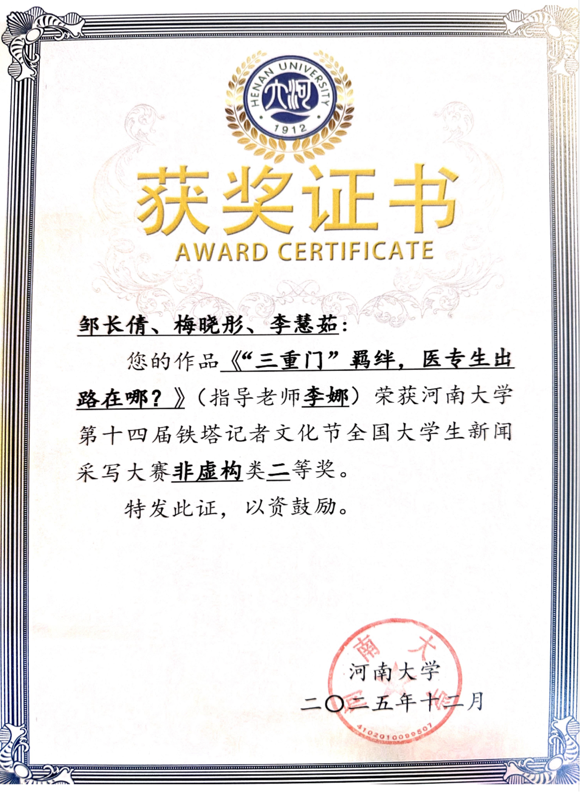 荣获二等奖的作品来自于新闻学和网络与新媒体两个专业的同学。2023级新闻学专业学生邹长倩、梅晓彤、李慧茹的作品《“三重门”羁绊,医专生出路在哪?》荣获非虚构类二等奖;2023级网络与新媒体专业学生魏羽桐、张梦瑶、吴靖慧的《“新农人”在行动——河南大学生返乡创业,把握时代“鸡”会》获通讯类二等奖,卢凯娜的《世界第一高桥通车,更要让“世界第一”直抵人心》获评论类二等奖;2021级网络与新媒体专业学生常家宝、张瑞萌、魏晓莎的《国棉记忆》获视听类二等奖。