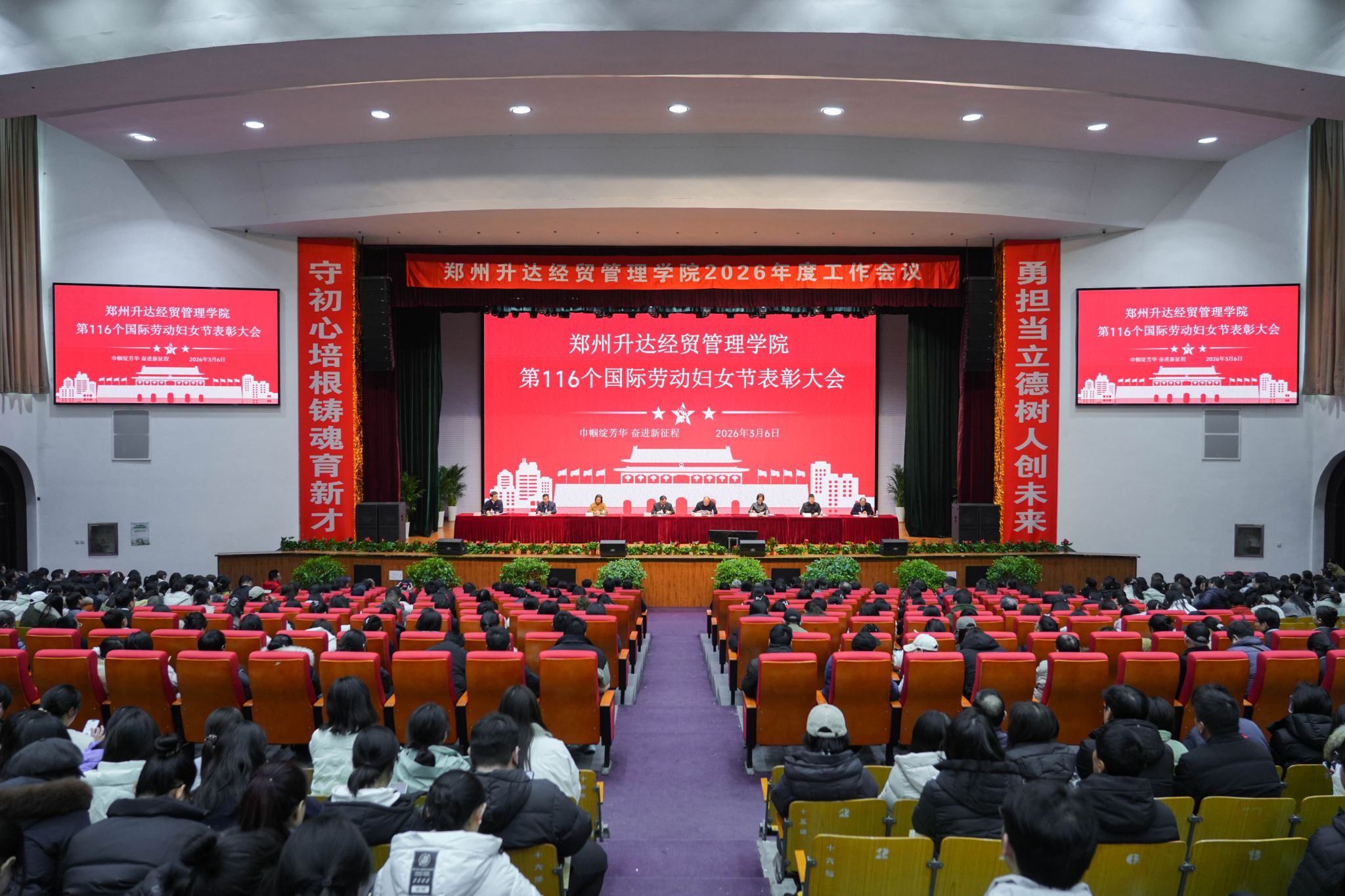 3月6日上午,我校2026年“三八”国际劳动妇女节表彰大会在思源会馆隆重举行。河南省民办教育协会会长、河南省教育厅原巡视员任锋,河南省民办教育协会刘根成、汤保梅、朱玉峰、宋广伟、王玉琴、王彦月、周丽华、关大卫、付昌、徐俊茹、杨泉、薛继超等领导应邀出席。学校董事长王新奇,校党委书记杨志清,校长张欣,党委副书记、副校长、工会主席张金安,副校长张其武、登封校区党工委书记沈定军等领导出席会议。全体教职工参会,共同庆祝第116个国际劳动妇女节,大会由张金安主持。