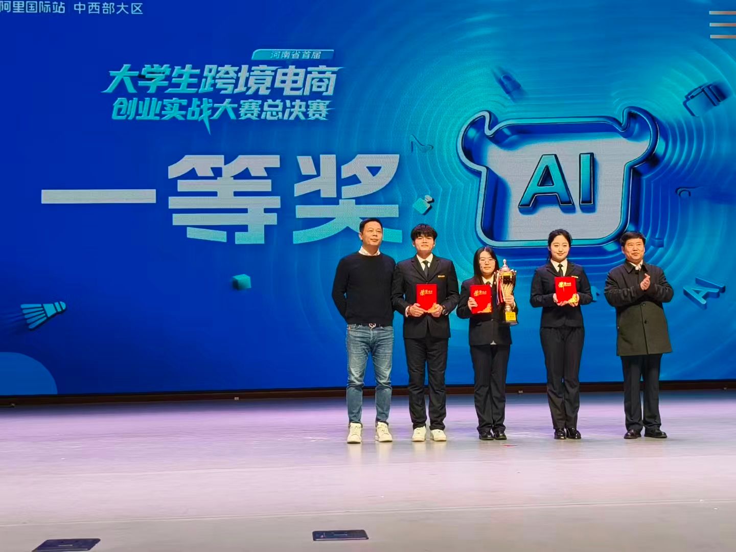3月19日,阿里国际站河南省首届大学生跨境电商创业实战大赛总决赛现场,当主持人宣布最终结果的那一刻,全场沸腾——我校金融贸易学院国贸团队,从全省25所高校、268支参赛团队、1089名参赛选手中脱颖而出,勇夺大赛第一名!
