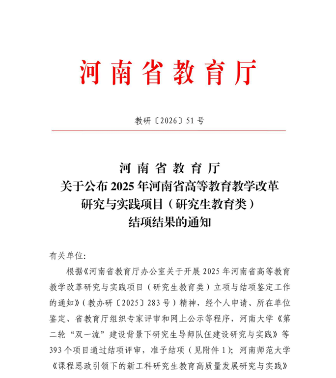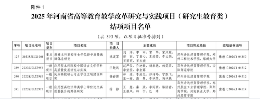 根据《河南省教育厅办公室关于开展2025年河南省高等教育教学改革研究与实践项目(研究生教育类)立项与结项鉴定工作的通知》(教办研〔2025〕283号)精神,经个人申请、所在单位鉴定、省教育厅组织专家评审和网上公示等程序,我校沈定军主持的《新建本科高校学士学位授予质量保障体系研究》等4个项目顺利结项。