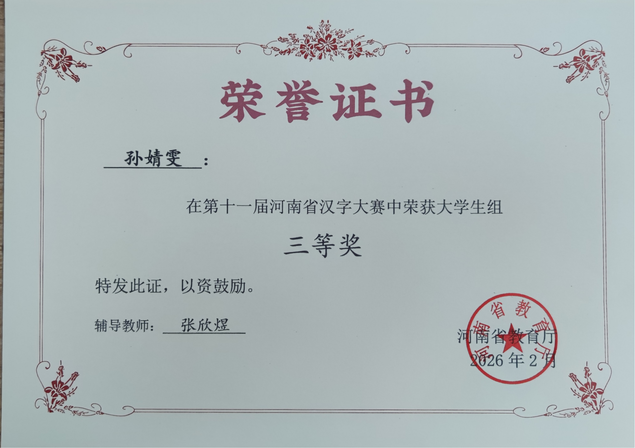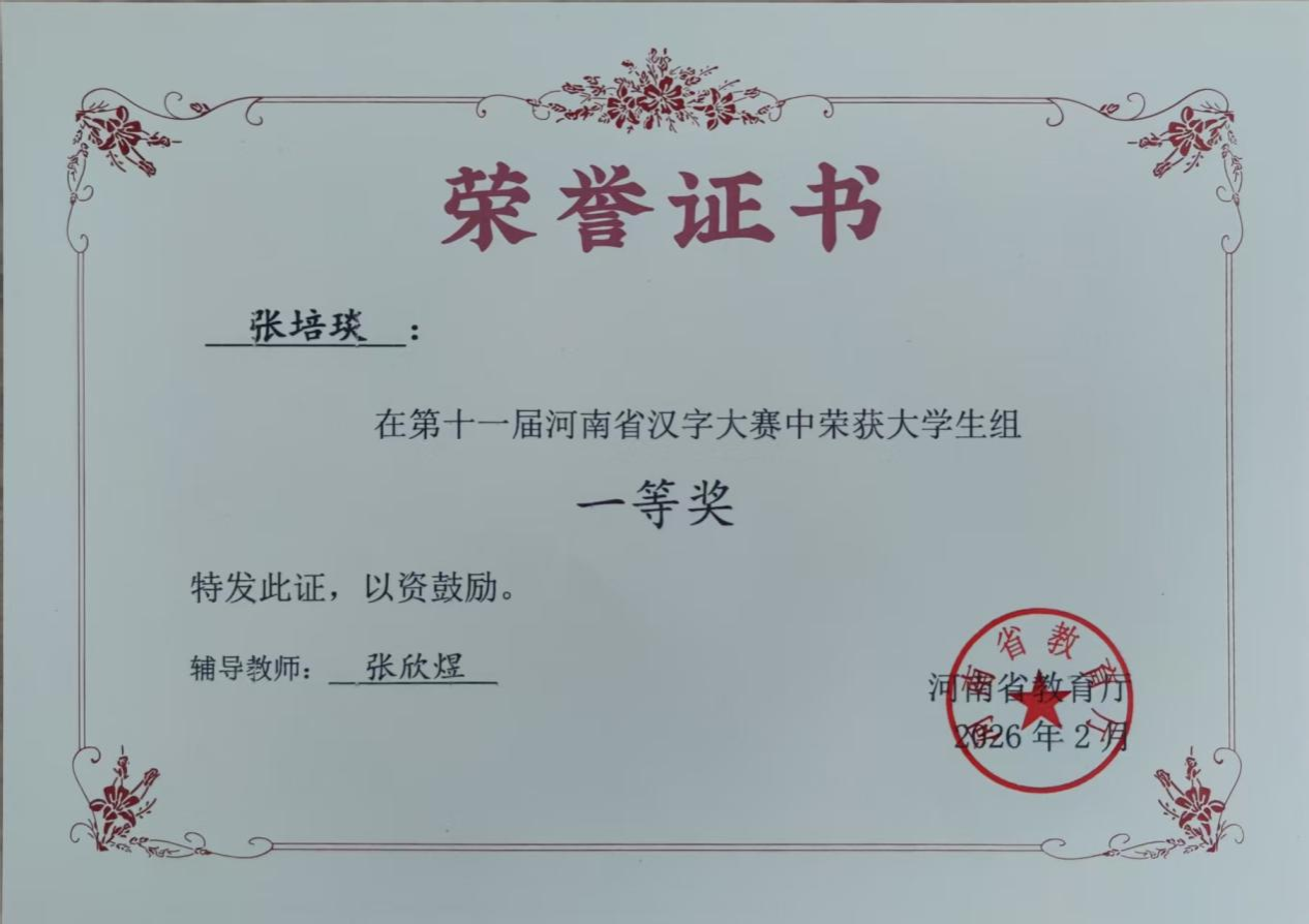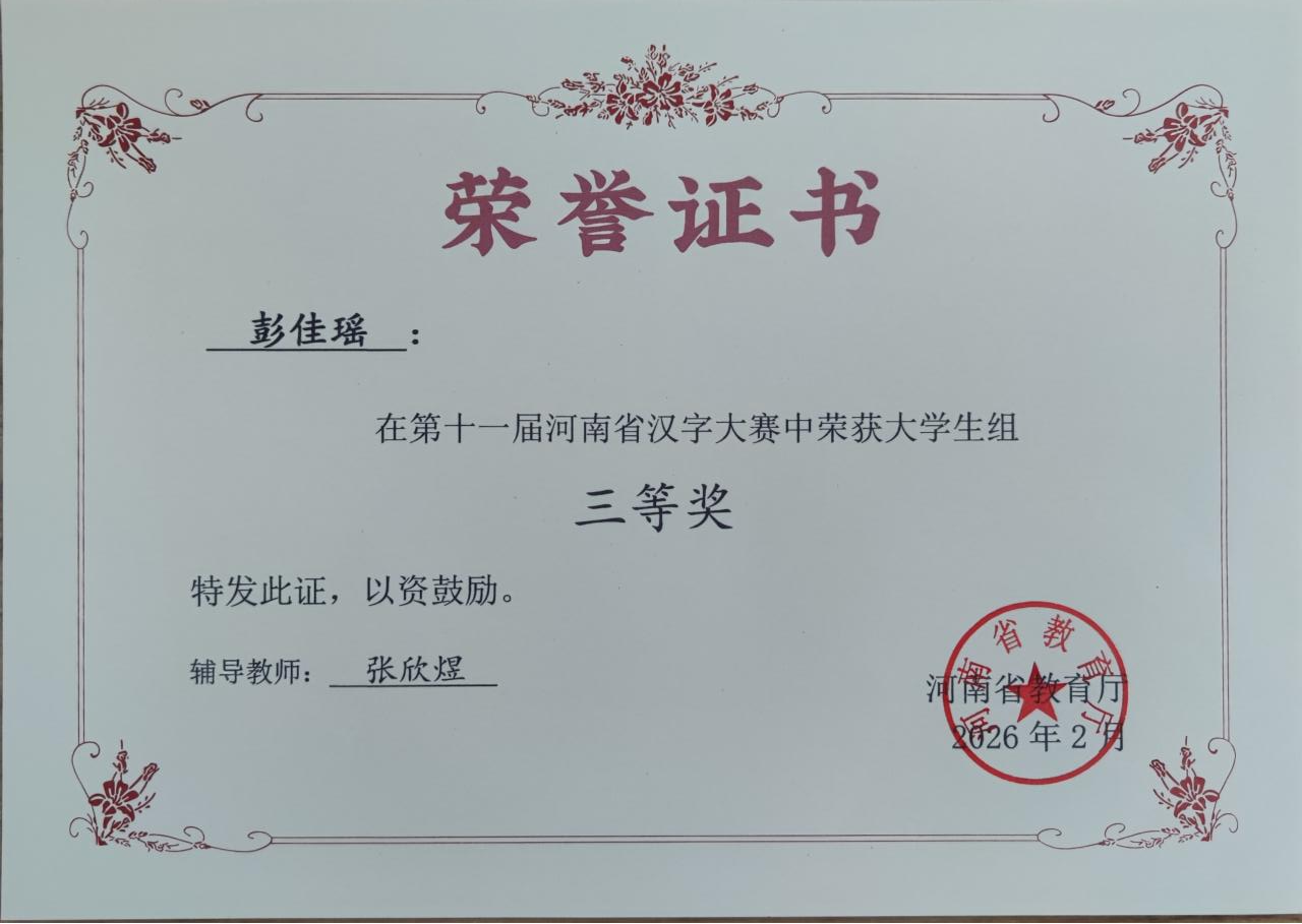 近日,由河南省教育厅主办,河南日报社、中国移动通信集团河南有限公司等单位共同承办的第十一届河南省汉字大赛决赛隆重举行,来自全省100多所高校的选手齐聚一堂,共赴文字盛宴。我校语委积极组织校级初赛,在校领导的关怀支持下,经严格选拔,3名优秀学子代表我校参赛,最终荣获一等奖1项,三等奖2项。