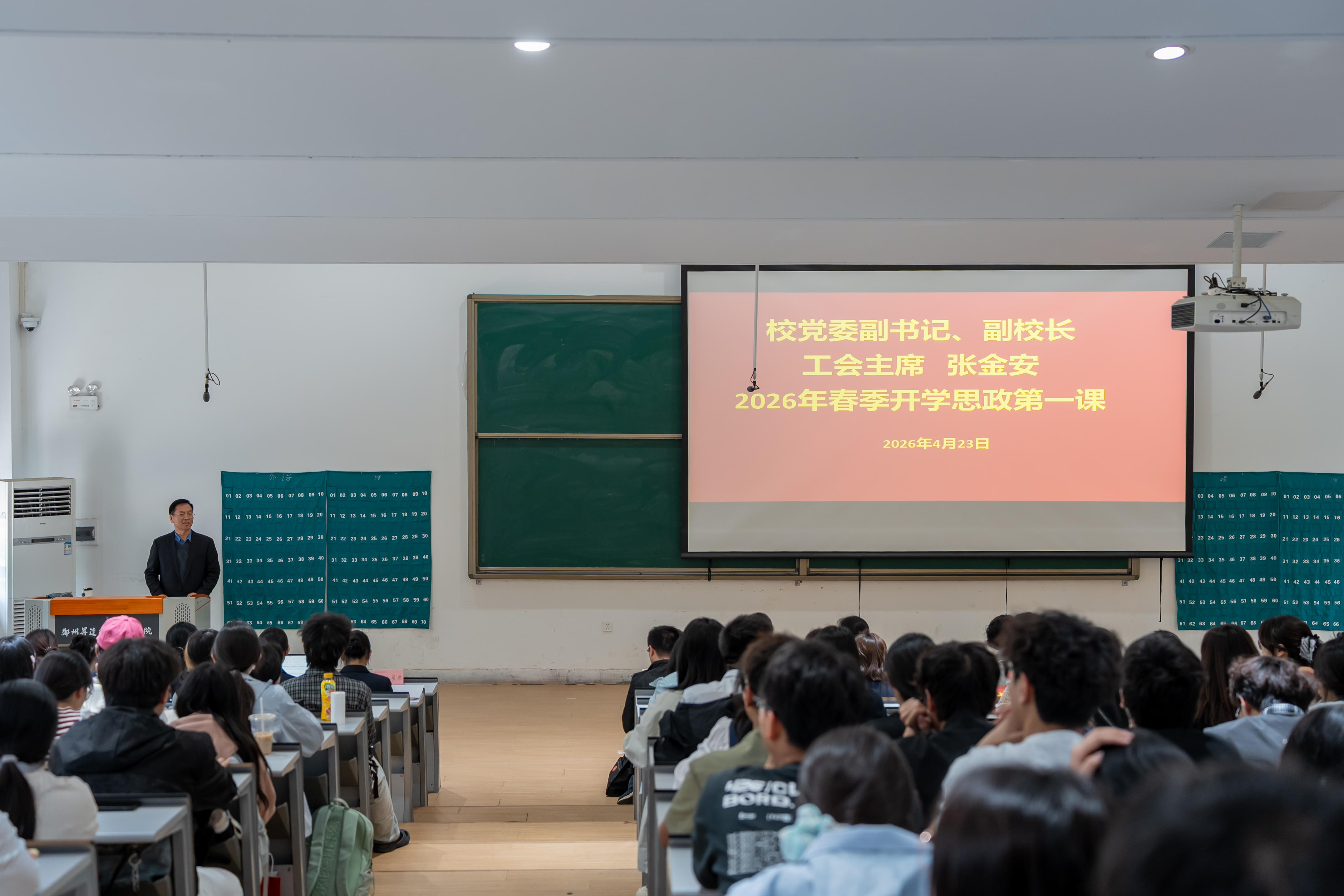 为深入学习贯彻习近平新时代中国特色社会主义思想,全面落实立德树人根本任务,4月23日下午,校党委副书记、副校长、工会主席张金安以《书香铸魂,以文化人》为题,在教学一号楼118教室为各学院师生代表讲授2026年春季开学思政第一课。