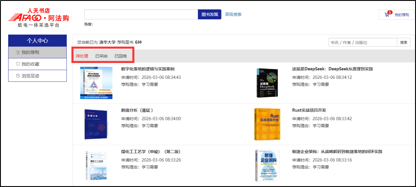 3、我的荐购:【个人中心】→【我的荐购】中可查看到所有的荐购书目及图书馆的采纳情况。