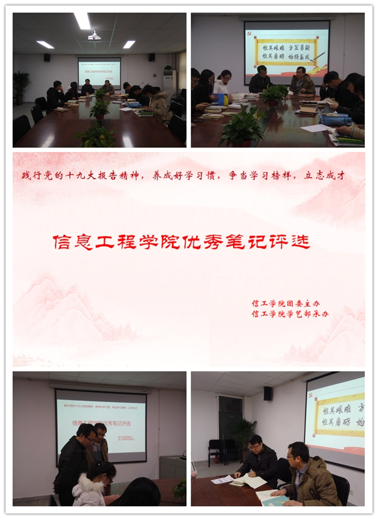 为践行党的十九大报告精神,使学生养成好学习惯,争当学习榜样,立志成才。信息工程学院于12月20日至12月26日举行优秀课堂笔记评选活动。我院部分任课老师,全体辅导员老师等参与此次优秀笔记评选活动。本次活动由我院团委学生会主办,院学艺部承办。