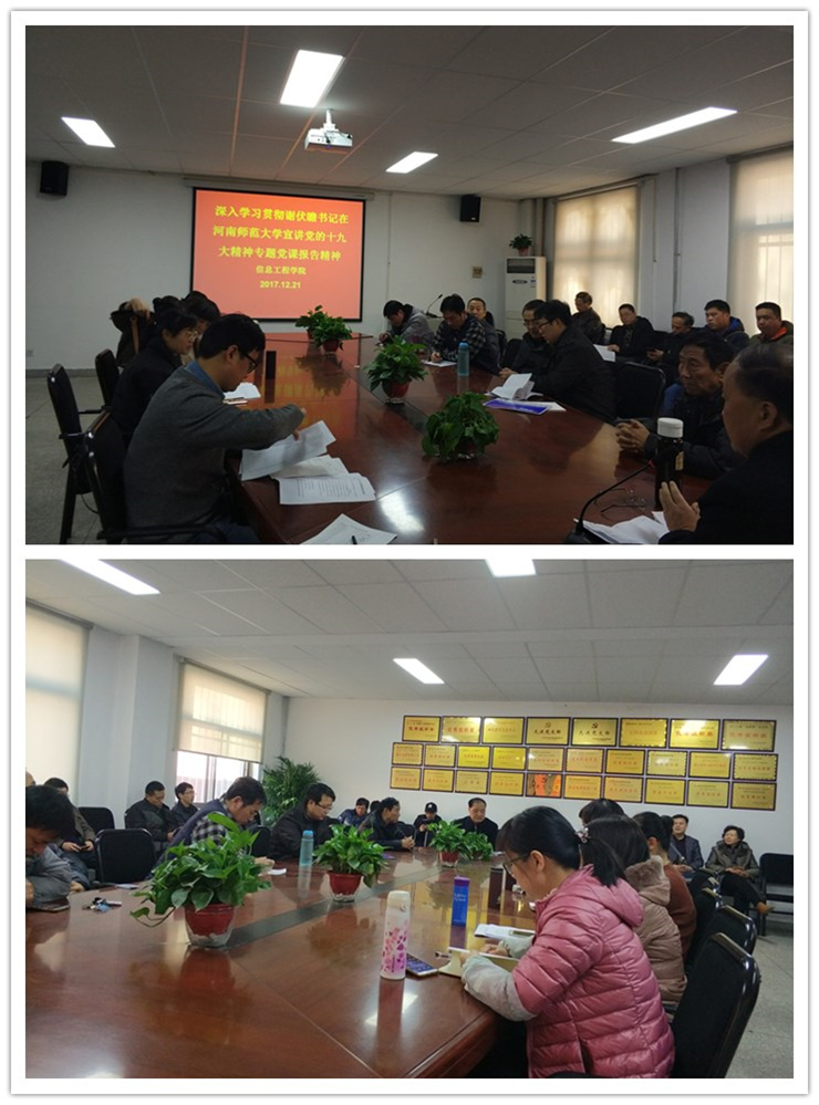 2017年12月21日下午,信息工程学院全体教职工开展政治学习活动,深入学习贯彻谢伏瞻书记在河南师范大学宣讲党的十九大精神专题党课报告精神。
