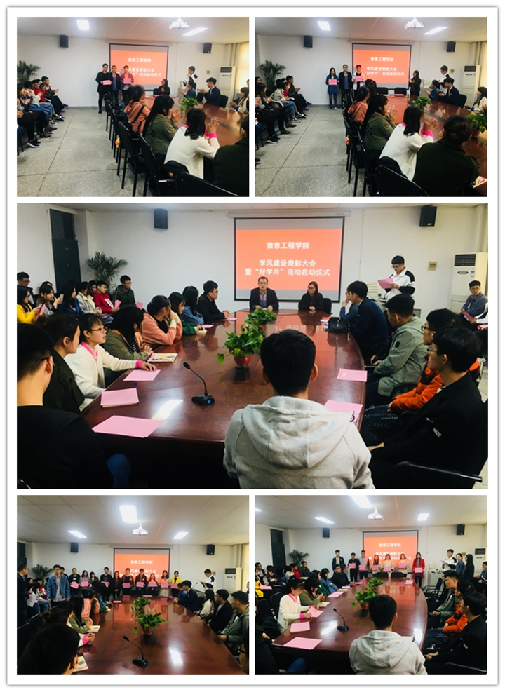 会议伊始,袁老师说,大学时代是人一生中最美好的时光,也是树立远大志向、系统学习知识、投身创新实践的最佳时机,我们大学生要以被表彰的同学为榜样,积极向上、宁静好学,勤奋学习,健康成长。并希望通过此次“好学月”活动能够帮助同学们养成良好的学习习惯,树立远大的人生目标,还要将创新思维和社会实践结合起来,在提高学习成绩的同时,还要提高自己的动手实践能力。希望同学们能够带动自己身边的同学,帮助他们养成良好的学习习惯。在我院学艺部的积极组织下,分别为在本次学风建设活动中获得“优秀辅导员”“先进班集体”和“先进个人”的老师、班集体和同学颁发证书。最后,袁老师宣布信息工程学院“好学月”活动正式启动。