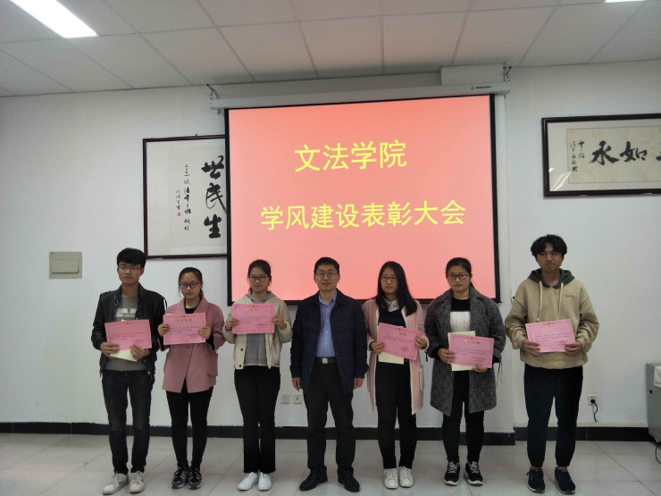 首先,段院长对获得学风建设先进个人的同学表示祝贺,为他们能够继承文法学院的好学传统而欣慰;接着段院长讲到,现在距离学校接受教育部的评估仅剩两个月,在这短短两个月的时间内,希望大家戒骄戒躁,继续发扬踏实好学的传统,并通过自身行为影响身边的人,影响全院乃至全校同学,让学习成为同学们的一种习惯。最后,由段院长和郑老师为获奖同学颁发证书和奖品并合影留念。