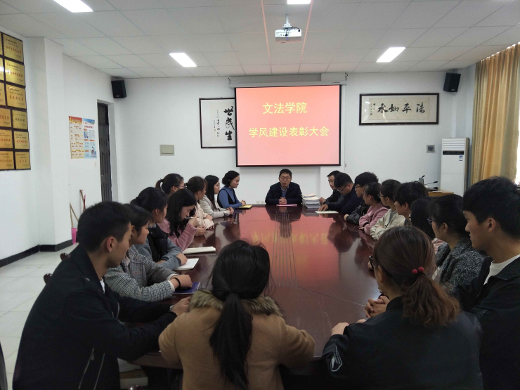 3月13日上午十点,文法学院在院会议室召开学风建设表彰大会,本次会议由行政秘书郑玲玲老师主持,院长段丰乐、全体辅导员及各班学风建设先进个人、各班学生代表参会。