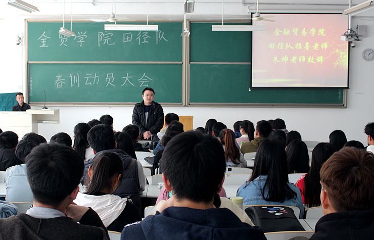 新年伊始,万物复苏,金融贸易学院田径队也迎来了新学期的训练。2018年3月12日13:00,由金贸学院团学会主办,体育部承办的第21届金贸学院田径队春训动员大会于时金楼115教室举行。到场的嘉宾有:金贸学院田径队指导老师兼17级辅导员朱帅老师,17级辅导员常单单、苏浩、徐依凡老师,团委副书记李征宇,学生会主席李浩天,社联理事长白嘉伟,学生会副主席李宏润、郭晓阳、李丽娜,及各部部长。本次动员大会旨在鼓励田径队队员积极参加训练,增强田径队队员敢于挑战自我的决心。