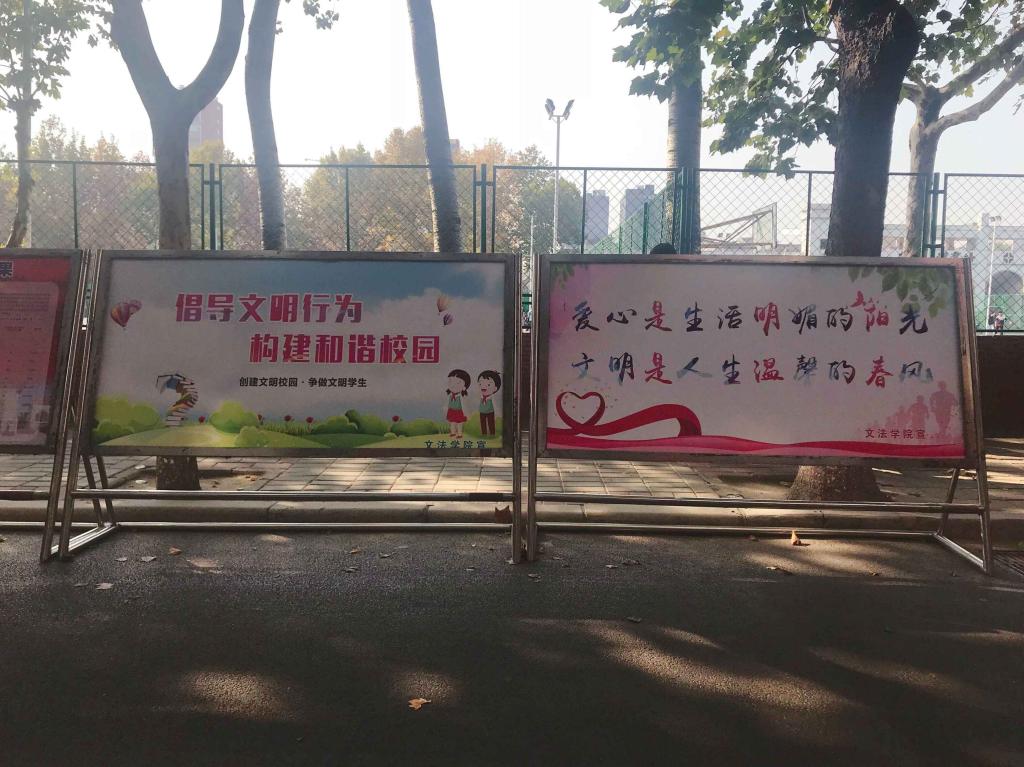 10月29日,文法学院制作两块文明标语展板摆放于主干道,宣传教育全体学生“讲文明,树新风”。