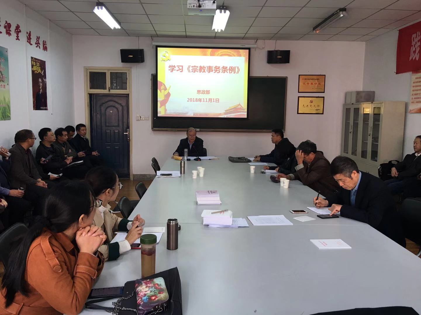 11月1日下午,根据学校党委的统一部署,在综合楼211思政部会议室,思政部直属党支部窦峰书记组织思政部全体教师认真学习讨论了2017年6月14日国务院第176次常务会议修订、2018年2月1日起施行的《宗教事务条例》。