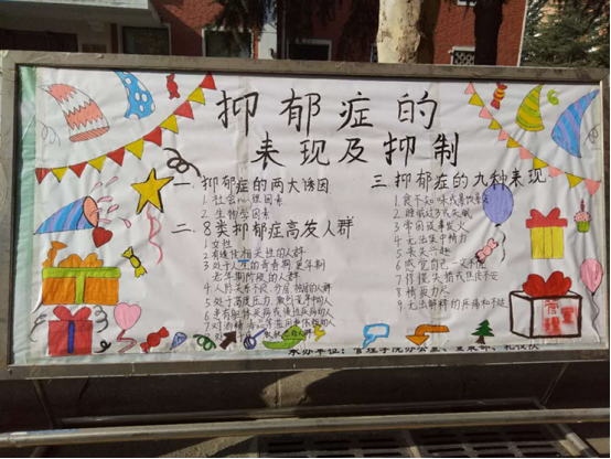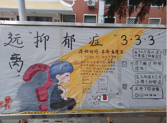 随着社会的不断发展,抑郁症的发病率越来越高,也越来越趋向于年轻化。近年来,很多大学生由于学习、工作或者生活中各种各样的问题成为抑郁症的高发人群。抑郁症对患者的身心健康会造成很大的危害,严重的患者甚至会出现自杀的念头和行为。管理学院心理辅导站于11月26-12月3号开展“远离抑郁三三三”活动引导同学们认识抑郁,了解如何简单的鉴别抑郁,开展远离抑郁的活动,引导同学们关注自身心理健康。