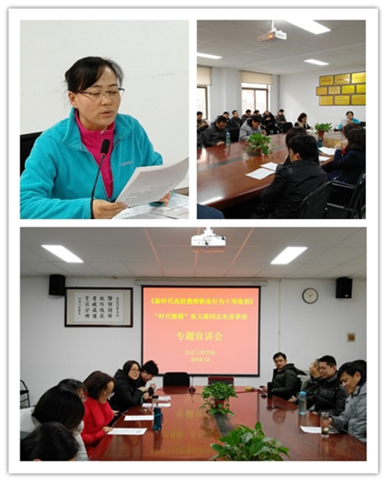 根据学校政治学习安排,12月7日下午14点,信息工程学院在资讯楼104会议室学习:教育部印发的《新时代高校教师职业行为十项准则》和“全国优秀教师”“全国中小学优秀德育课教师”“全国师德标兵”“全国岗位学雷锋标兵”“河南省五一劳动奖章”获得者、中宣部表彰的“时代楷模”张玉滚同志先进事迹,两个文件精神。