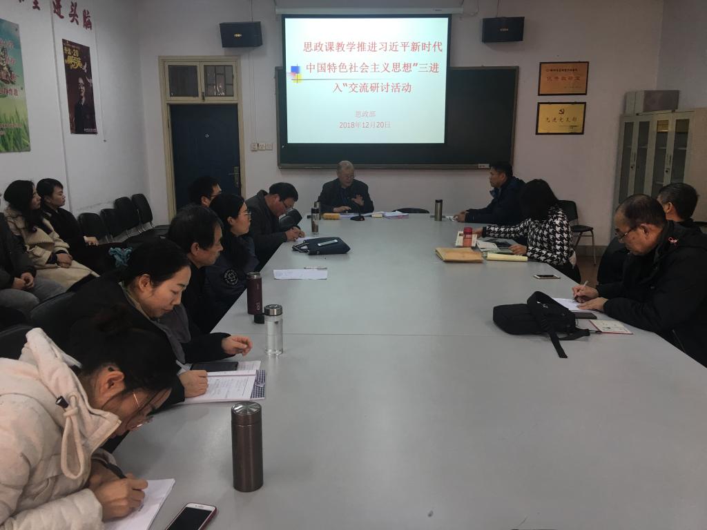 12月20日下午,在综合楼211会议室,思政部召开了推进习近平新时代中国特色社会主义思想“三进入”交流研讨活动。会议由思政部主任朱慈华教授主持,直属党支部书记窦峰副教授、教学秘书晏玲玲和全体思政课教师参加了交流研讨活动。