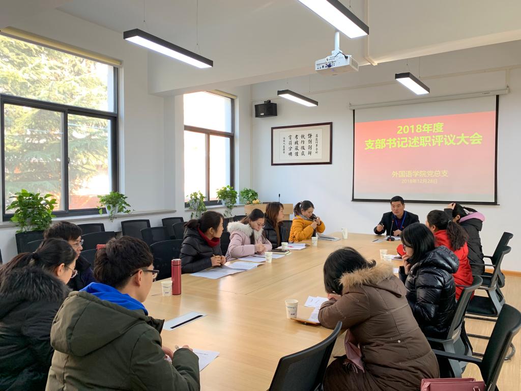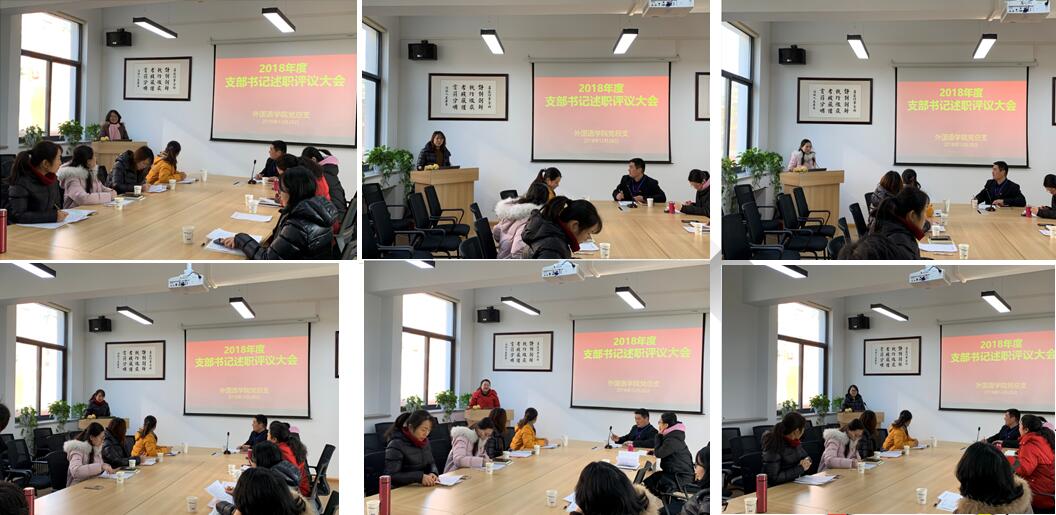 为深入学习贯彻习近平新时代中国特色社会主义思想和党的十九大精神,进一步加强基层党组织建设,促进各支部交流工作经验。2018年12月28日下午,外国语学院在教学1号楼206会议室召开2018年度党支部书记述职评议会。党总支石皓召书记、各党支部书记、教师党员代表、学生党员代表、群众代表等参加会议。