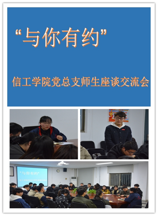 新学期伊始,为了解学院各班同学们的思想动态和学习情况,积极为同学们提供更好的服务,帮助学生成长成才。2019年2月27日19点,在资讯楼104会议室举行“与你有约”信工学院党总支师生座谈交流会。信工学院党总支王新平书记以及各班班长、团支书出席了本次会议。