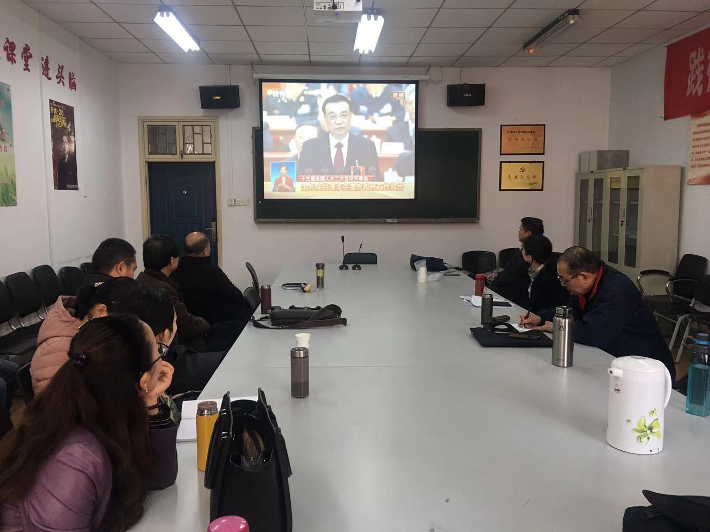 3月5日上午,十三届全国人大二次会议在人民大会堂举行开幕式。思政部组织全体无课教师在会议室集中收看了开幕式直播,听取了国务院总理李克强向大会作的政府工作报告。在收看直播的过程中,每位老师都聚精会神、仔细聆听、边听边记,现场不断爆发出阵阵掌声,气氛格外热烈。老师们对去年取得的成绩深受鼓舞,在听到涉及“减税降费”“教育”“污染防治”等今年的重点工作时,更是精神振奋。收看现场直播结束后,围绕李克强总理的报告组织了大讨论。