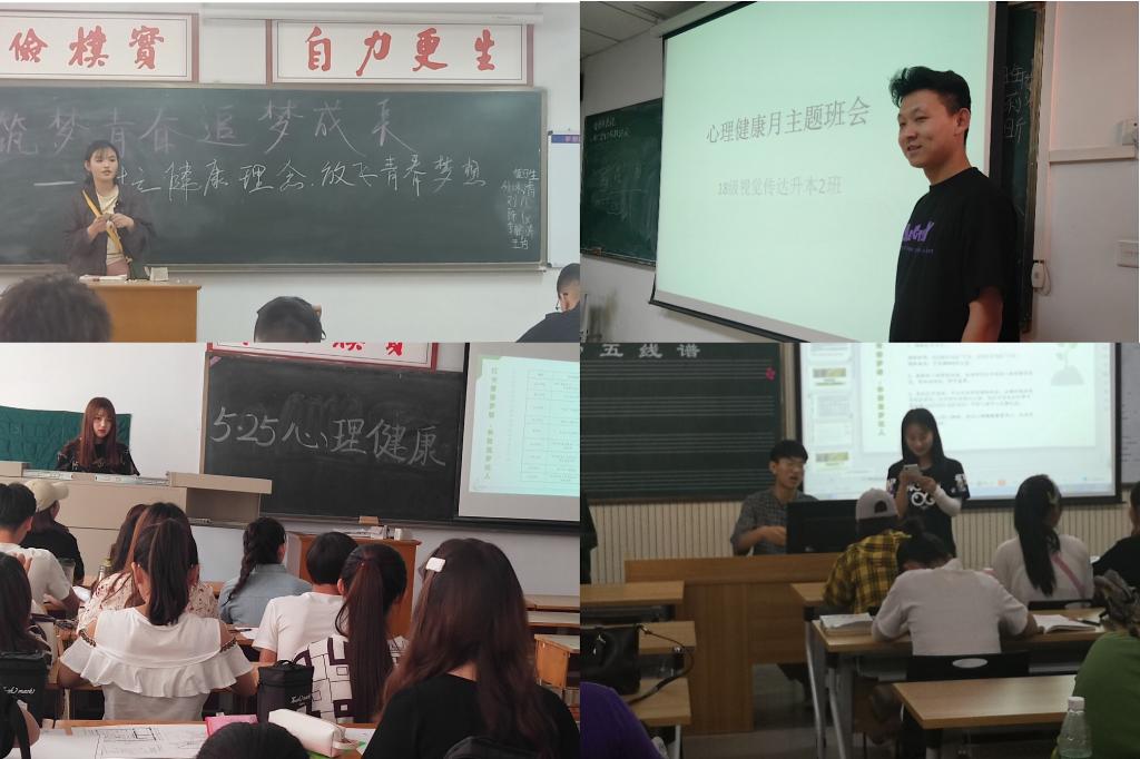 为了更好地宣传普及心理健康知识,促进同学们自觉维护自身的心理健康,也为了让同学们从繁重的学业中放松自我。以“5·25大学生心理健康月”为契机,艺术学院各班级心理委员于5月20日-5月22日在本班级积极开展以“树立健康理念,放飞青春梦想”的主题班会活动。