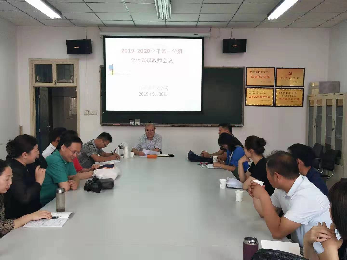 8月30日上午8:10分,在综合楼214会议室,马克思主义学院召开2019-2020学年第一学期全体兼职教师会议,部署本学期教学工作。马克思主义学院院长朱慈华教授、直属党支部书记窦峰副教授、教学秘书晏玲玲老师、各教研室主任和全体兼职教师参加了本次会议。会议由朱慈华院长主持并发表讲话。