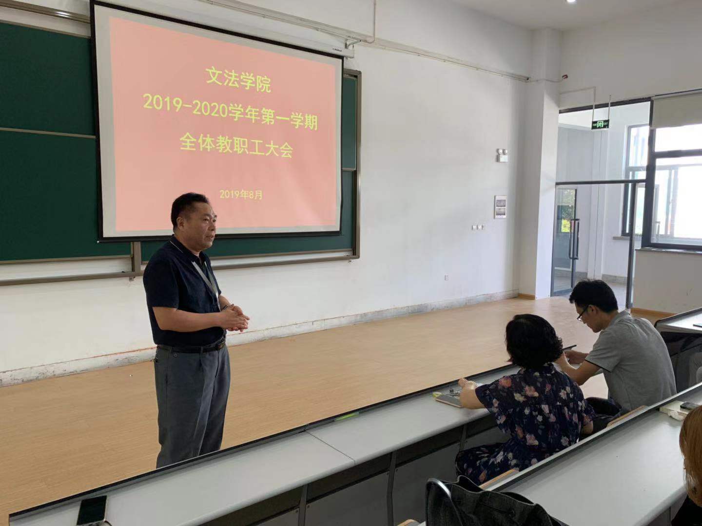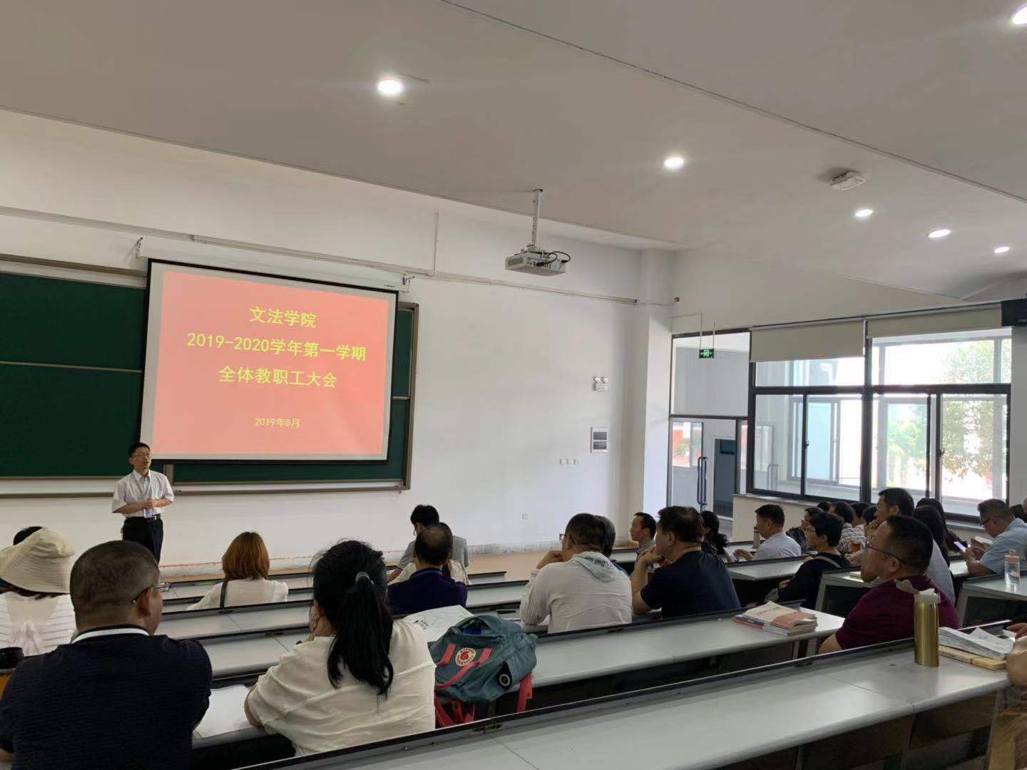 秋高气爽,万里无云。8月30日上午11时文法学院在教学一号楼118召开全体教职工大会,参加会议的有院长段丰乐、党总支书记杨明志、教学秘书李南方、行政秘书郑玲玲,全体专兼职教师和辅导员。会议由段丰乐院长主持。