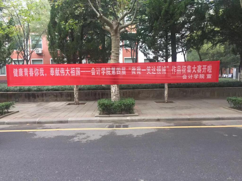 会计学院在龙湖食府前的朴实路悬挂条幅进行心理健康活动周“健康青春你我,奉献伟大祖国”主题活动宣传