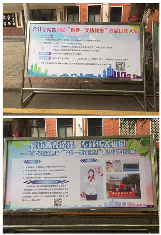 为进一步推进《高等学校学生心理健康教育指导纲要》落地落实,提升心理育人工作质量,提高大学生心理健康水平和心理健康素质,我院积极响应校心理咨询中心的工作部署,于10月21日——24日,顺利举办了第四届“微微一笑达倾城”作品征集大赛等系列活动。
