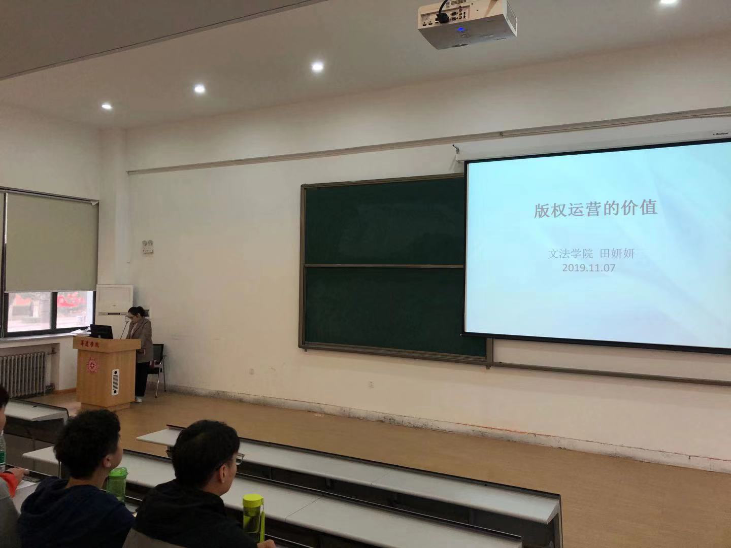 为了提高文法学院各专业学生的实务训练综合素养,文法学院拟计划开展数场由本学院教授、副教授承担的系列讲座,2019年11月7日下午,面向有版权知识需求的2017级法学班和2017级新闻班的同学们,专职教师田妍妍副教授进行了第一场讲座,题目为“版权运营的价值”,法学教研室刘凡义主任主持。