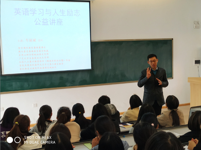 为进一步明确我校学生学习目标,11月22日下午14时在一号教学楼208教室,外国语学院为大一新生举办了一场《英语学习与人生励志》讲座,讲座邀请国内著名英语教育教学权威,智学国际教育集团车延斌董事长莅临主讲。
