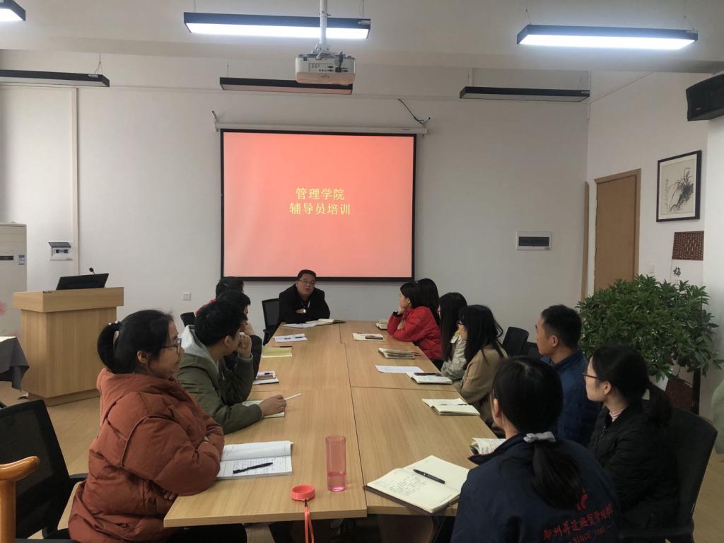 为深入贯彻落实《普通高等学校辅导员培训规划》(2013-2017年)、《普通高等学校辅导员队伍建设规定》(教育部令第43号)文件精神,加强辅导员队伍建设,进一步做好新时代学校大学生思想政治教育工作,2019年11月27日,管理学院在2号楼会议室举行辅导员培训会。会议由行政秘书许广庆主持。全院辅导员参加培训会。