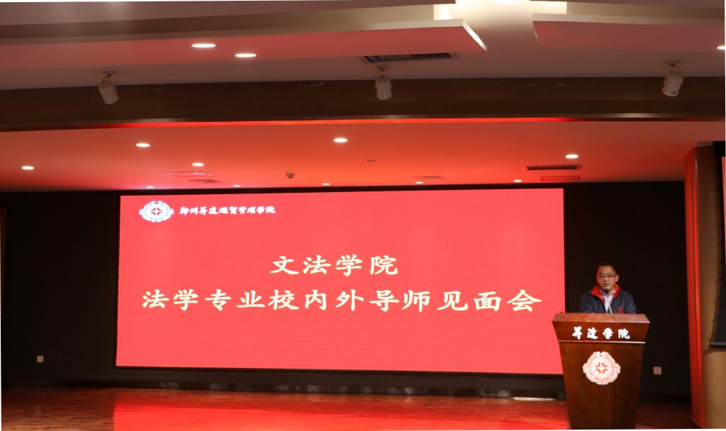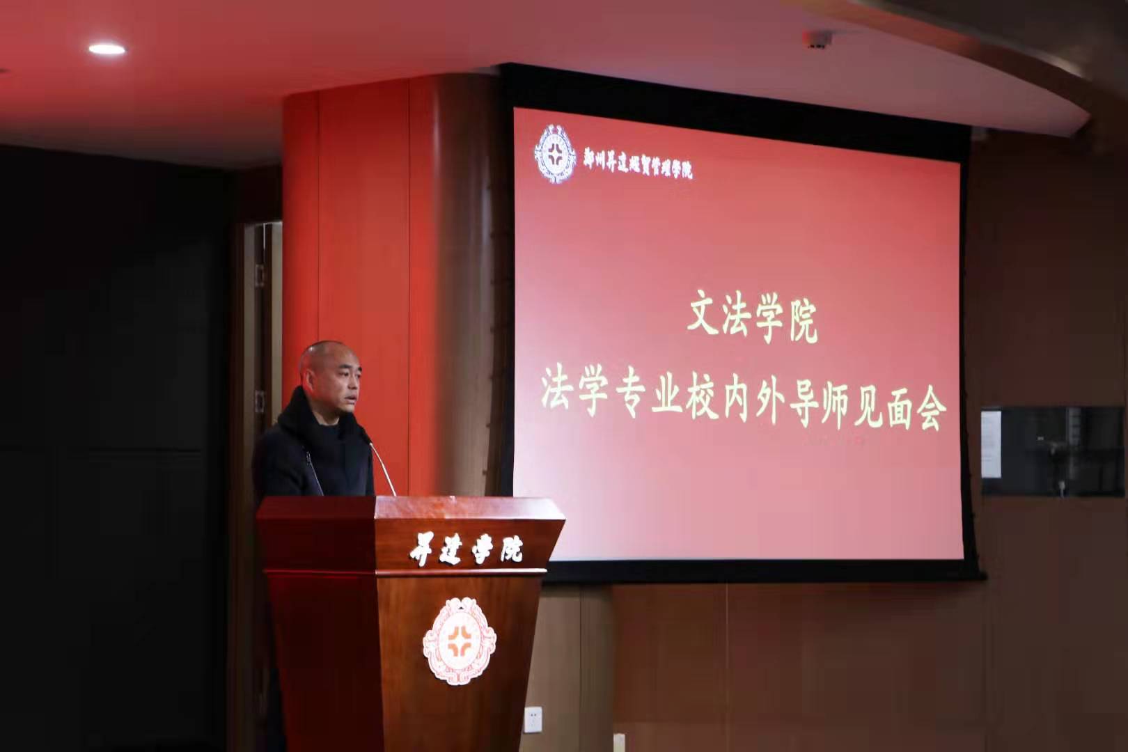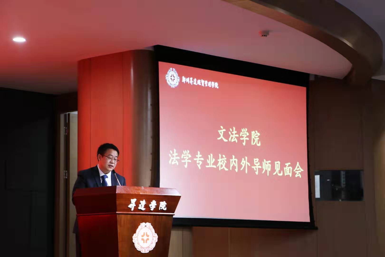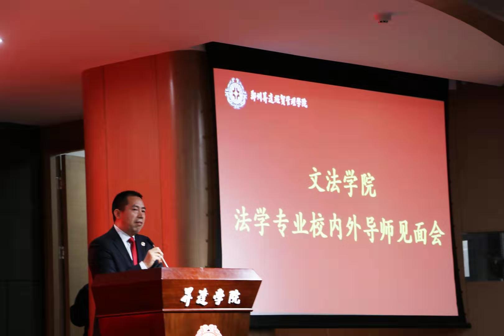 为了落实学校“地方性,应用型”的办学定位,培养应用型法学专业人才,文法学院积极拓展办学思路,健全完善育人体系,在校企合作的基础上积极开展合作育人的新尝试。在2019级法学专业新生中试行校内外双导师制。文法学院在校企合作单位中选聘了三十四位律师、职业经理人、法官等行业精英作为校外导师,与校内专业教师相衔接,共同对学生在大学四年的学习生活进行全方位全过程指导。11月28日下午14:30,文法学院在双创大讲堂隆重举行了法学专业校内外导师见面会。校外导师代表:京师(郑州)律师事务所李胜先主任、张春兴主任、张冬冬律师一行;海华永泰(郑州)律师事务所张虎主任、刘泽华主任、姬瑞明主任一行;河南安必信知识产权代理公司程保庆总经理一行;河南鼎德律师事务所刘阳主任、王辉主任、王永波律师一行;河南领英律师事务所许亮主任、王克昌律师一行等十余名校外导师代表莅校指导。学院段丰乐院长、党总支杨明志书记、教学秘书李南方老师、行政秘书郑玲玲老师、校友专员张喜超老师、2019级法学专业辅导员刘瑜老师以及法学专业教研室全体专任教师和2019级法学专业全体学生参加了见面会。会议由法学专业教研室主任刘凡义老师主持。