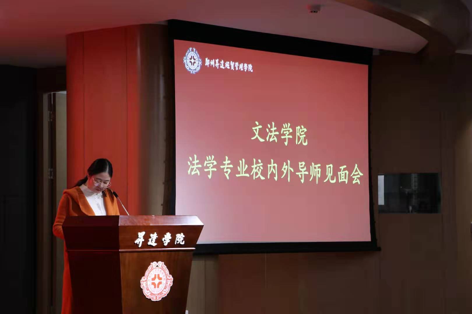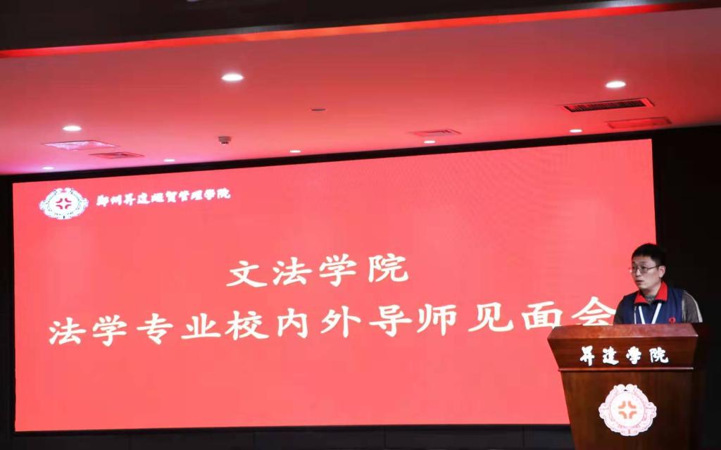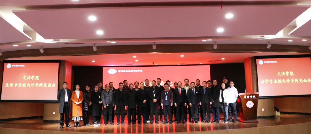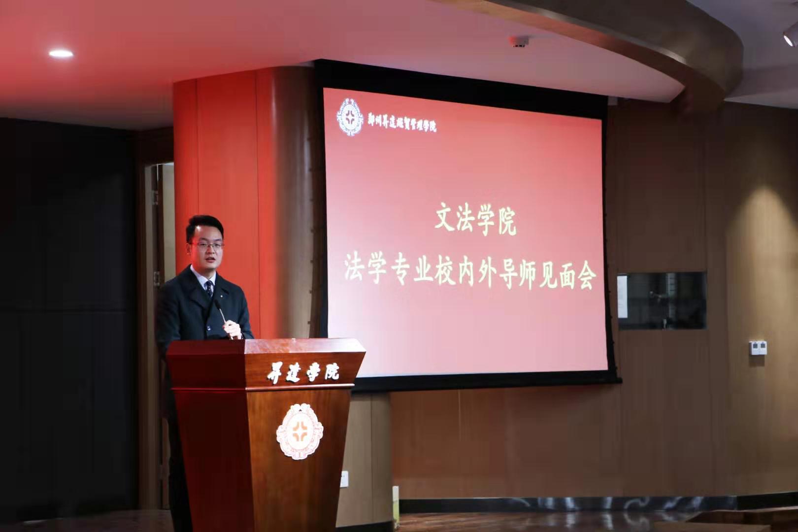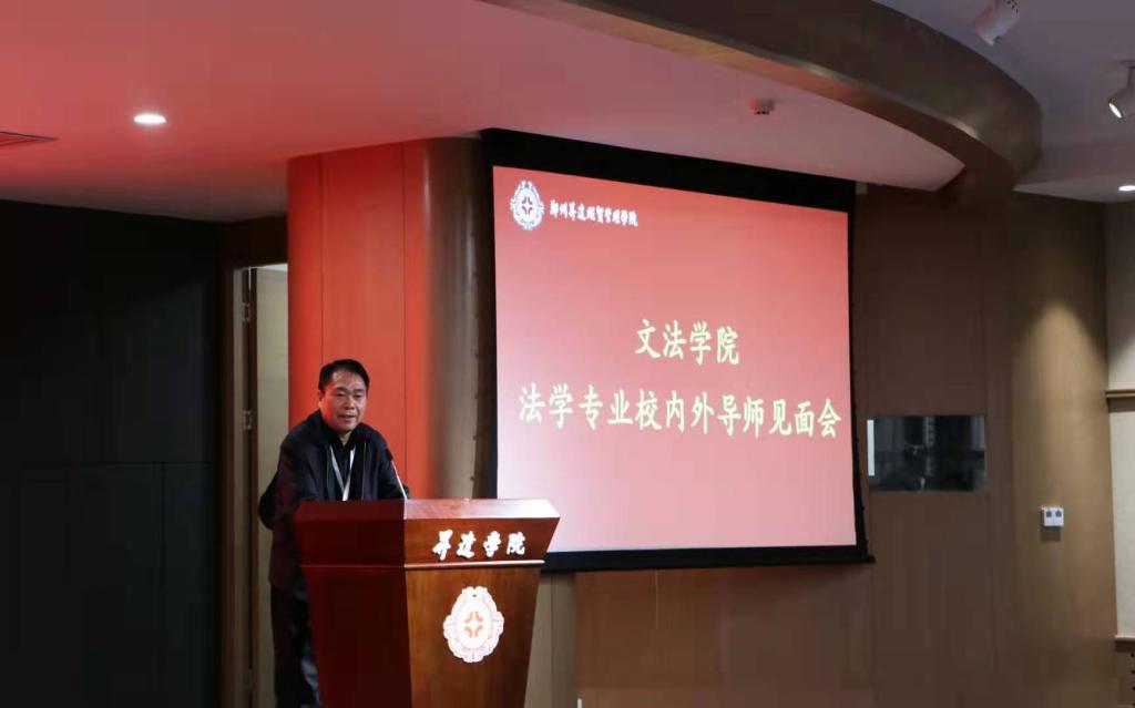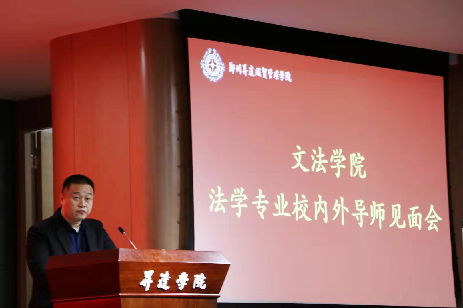 为了落实学校“地方性,应用型”的办学定位,培养应用型法学专业人才,文法学院积极拓展办学思路,健全完善育人体系,在校企合作的基础上积极开展合作育人的新尝试。在2019级法学专业新生中试行校内外双导师制。文法学院在校企合作单位中选聘了三十四位律师、职业经理人、法官等行业精英作为校外导师,与校内专业教师相衔接,共同对学生在大学四年的学习生活进行全方位全过程指导。11月28日下午14:30,文法学院在双创大讲堂隆重举行了法学专业校内外导师见面会。校外导师代表:京师(郑州)律师事务所李胜先主任、张春兴主任、张冬冬律师一行;海华永泰(郑州)律师事务所张虎主任、刘泽华主任、姬瑞明主任一行;河南安必信知识产权代理公司程保庆总经理一行;河南鼎德律师事务所刘阳主任、王辉主任、王永波律师一行;河南领英律师事务所许亮主任、王克昌律师一行等十余名校外导师代表莅校指导。学院段丰乐院长、党总支杨明志书记、教学秘书李南方老师、行政秘书郑玲玲老师、校友专员张喜超老师、2019级法学专业辅导员刘瑜老师以及法学专业教研室全体专任教师和2019级法学专业全体学生参加了见面会。会议由法学专业教研室主任刘凡义老师主持。