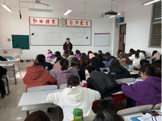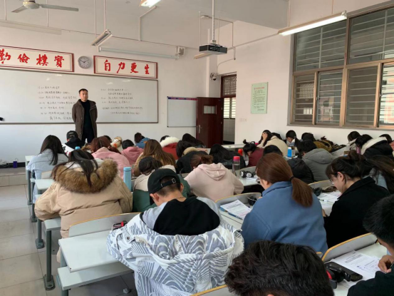 本次模拟考试主要由各班班委组织和监管进行的,任课教师在考试期间巡视所带班级的每个考场。经过周密的前期准备,此次模拟考试在13:20准时开始,严格按照全国大学英语四级考试流程进行。学艺负责在13:20之前在黑板上将考试流程及注意事项书写完毕,并协助同学们将手机入袋;13:30班长负责下发提前领取好的试题册、答题卡一、答题卡二;13:40考试正式开始,开始作答作文;14:05班长负责提示考生5分钟后开始听力考试,14:10听力考试正式开始;14:35听力考试结束,停止作答,摘下耳机,班长负责回收答题卡一;14:40班长告知考生继续作答阅读理解和翻译部分;15:40班长提示考生10分钟后考试结束;15:50考试正式结束,班长负责回收答题卡二。