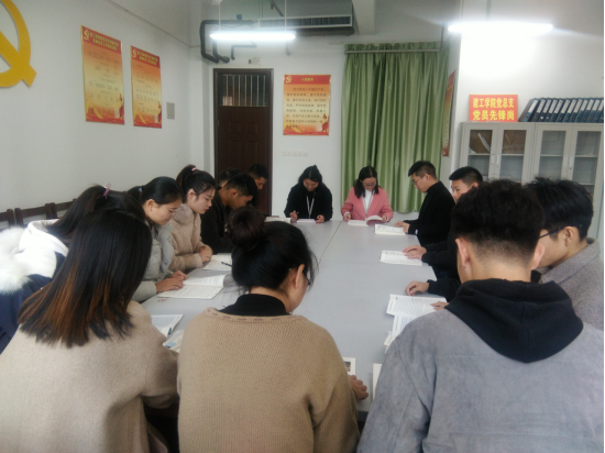 首先,郭艳老师向参会党员传达了会议精神,详细介绍了“不忘初心、牢记使命”专题组织生活会和民主评议党员大会会议流程。接着,徐黎光老师向大会报告支部“不忘初心、牢记使命”主题教育的开展情况、党员的教育管理情况、联系服务群众和改进工作风等做了深入剖析,并就党支部一年以来开展的工作向与会同志作了详细的汇报,此外还对去年民主评议会上支部所存在的问题整改情况作了汇报。